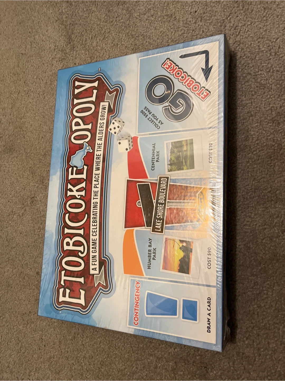 This is the Etobicoke monopoly board game, a fun game celebrating the place where the alders grow. It features locations like Centennial Park and Lake Shore Boulevard. This game is new and sealed.