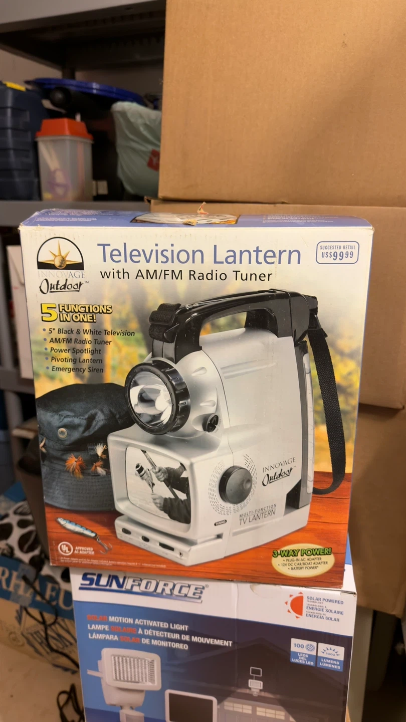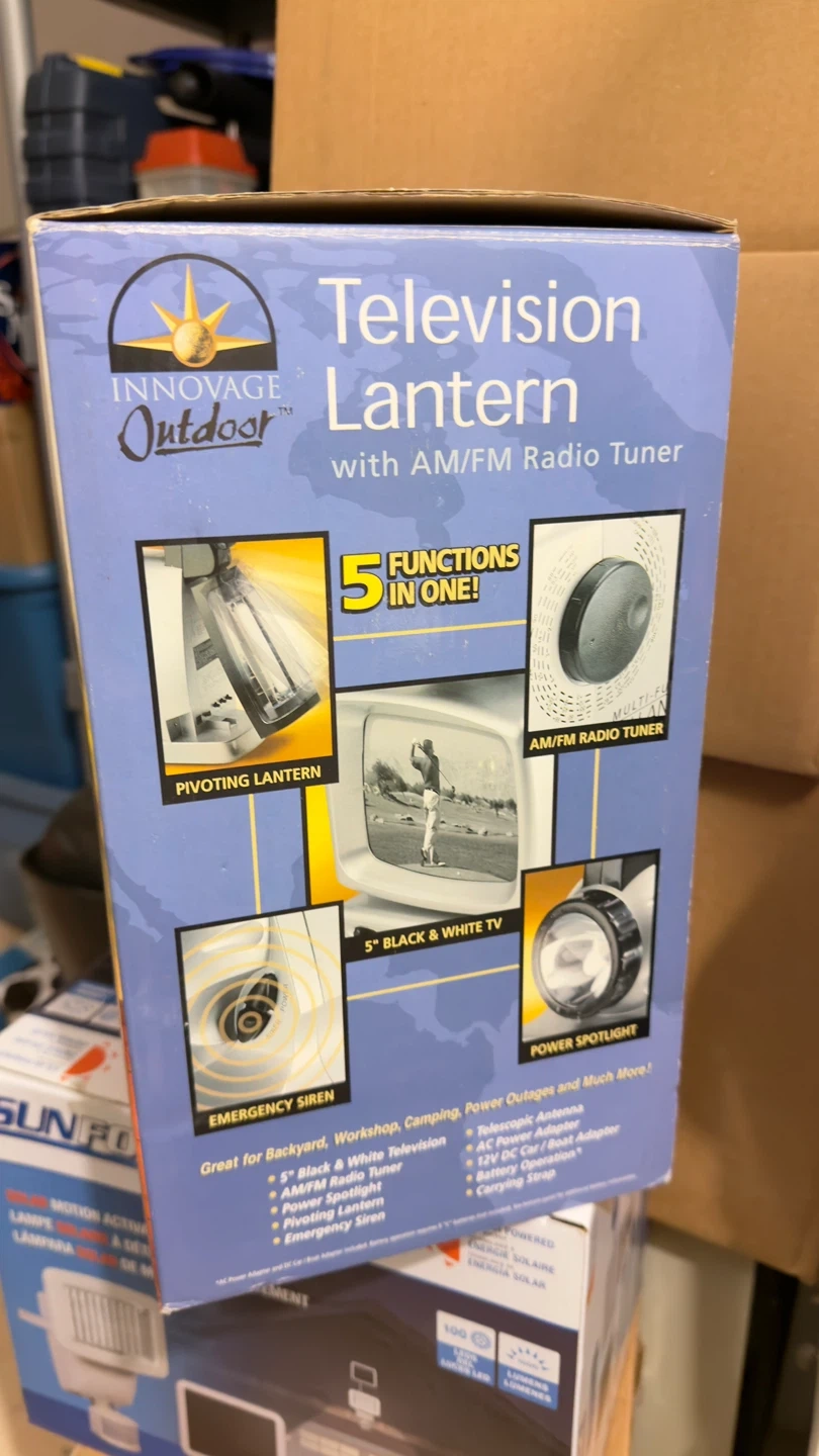 This Innovage Outdoor Television Lantern comes with an AM/FM radio tuner. It has 5 functions in one, including a 5" black & white TV, AM/FM radio, power spotlight, pivoting lantern, and emergency siren. It's great for backyard, workshop, camping, power outages and much more!