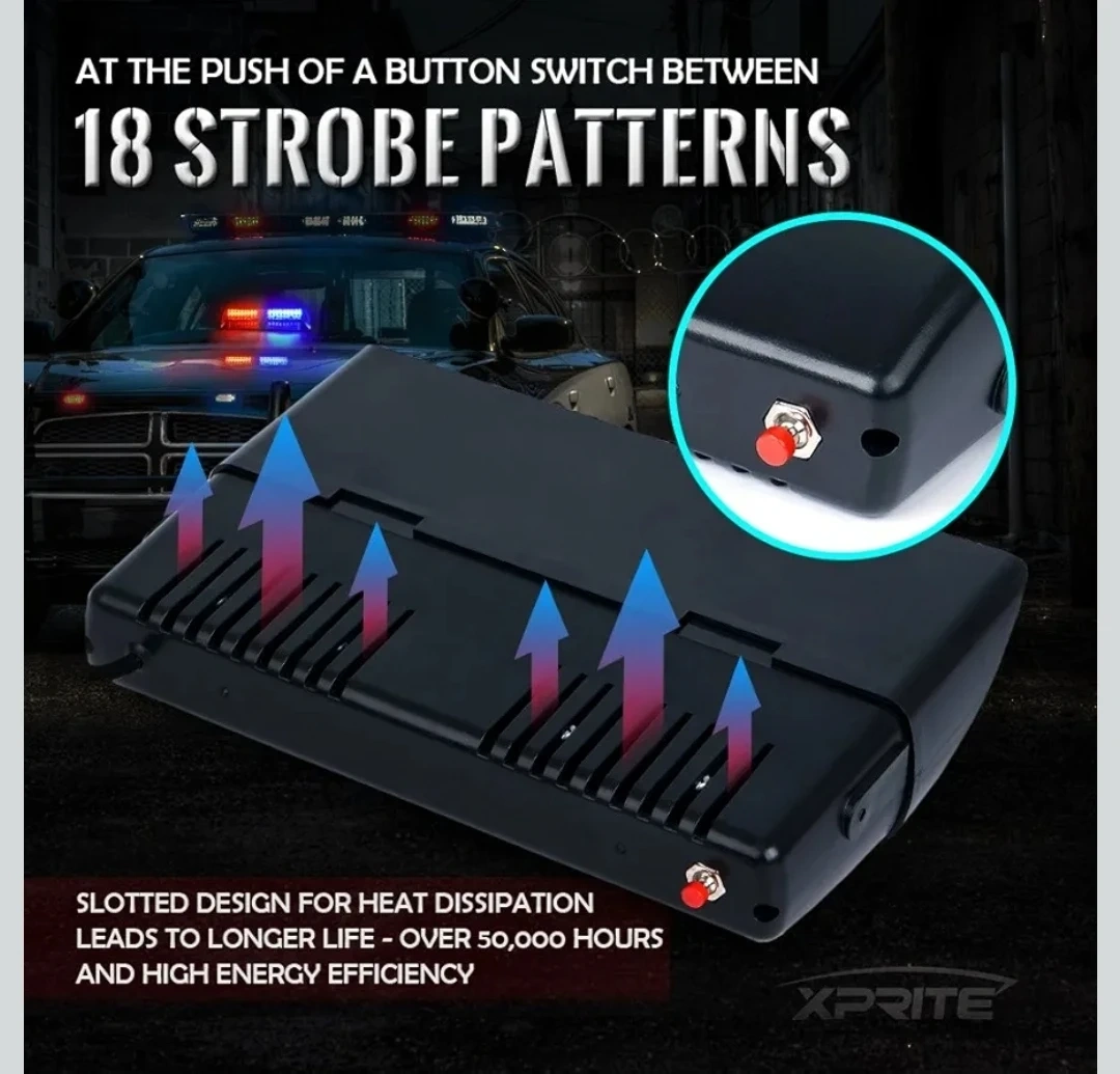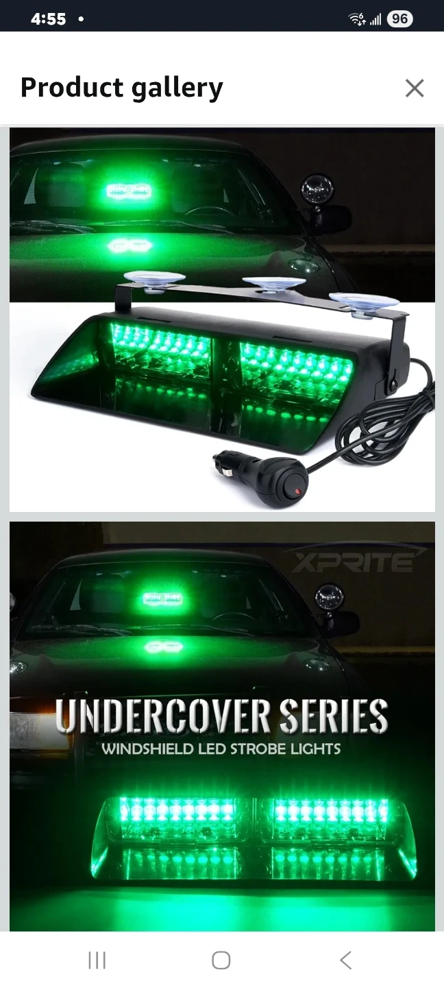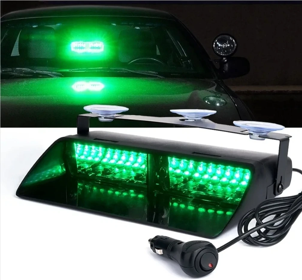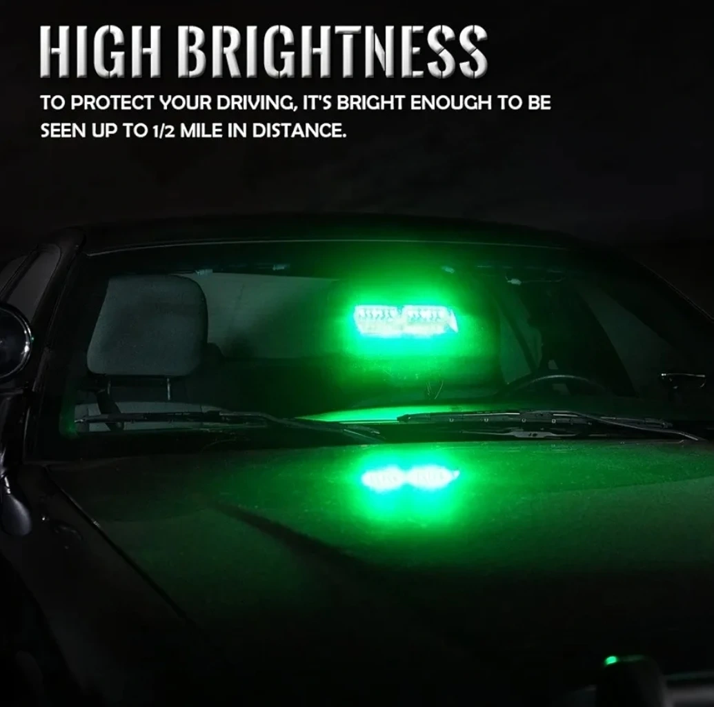 Xprite Undercover Series windshield LED strobe lights in green. It features 16 LEDs with 18 different strobe patterns and a cigarette lighter adapter connection. The cable length is 8 ft.