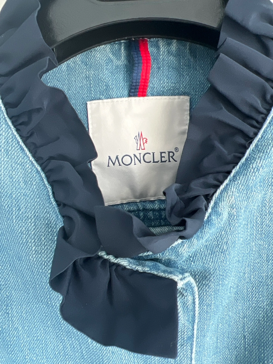Here's a stylish Moncler denim jacket! It features a unique design with a ruffled collar and cuffs, and a flattering fit. The jacket is in great condition and ready for a new home. Perfect for adding a touch of designer flair to your wardrobe