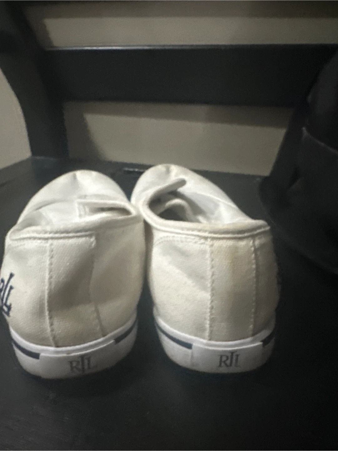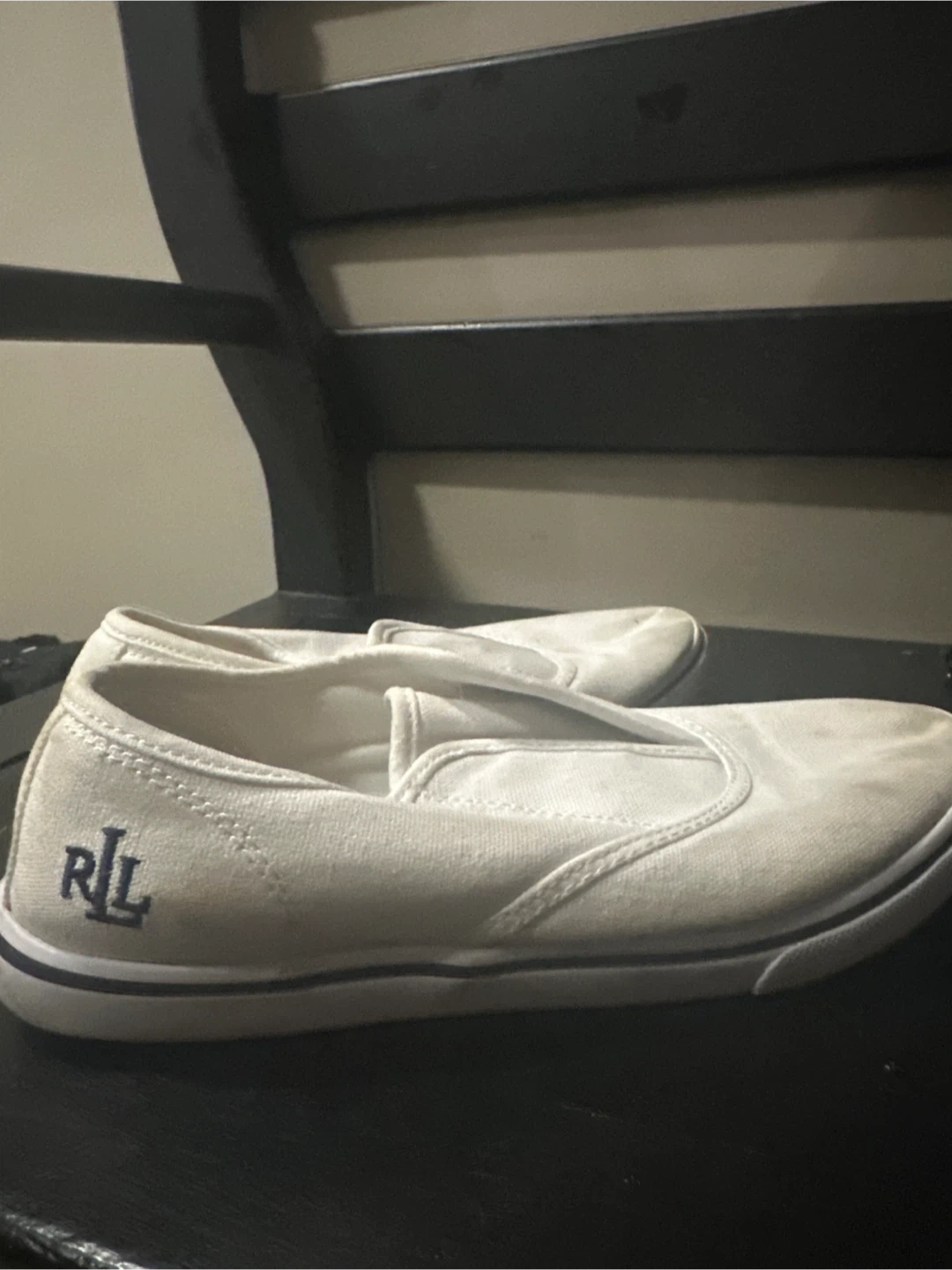 Selling a pair of Ralph Lauren slip-on shoes in white. They show some signs of wear, but still have lots of life left! Perfect for casual outings