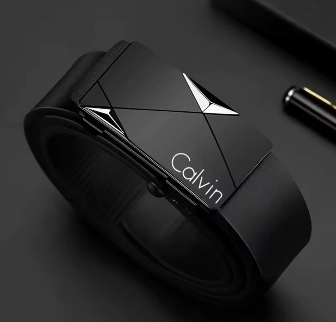 This is a black belt with a stylish buckle featuring a geometric design. It's made with a durable material suitable for everyday wear. This belt offers a sleek look for various outfits.