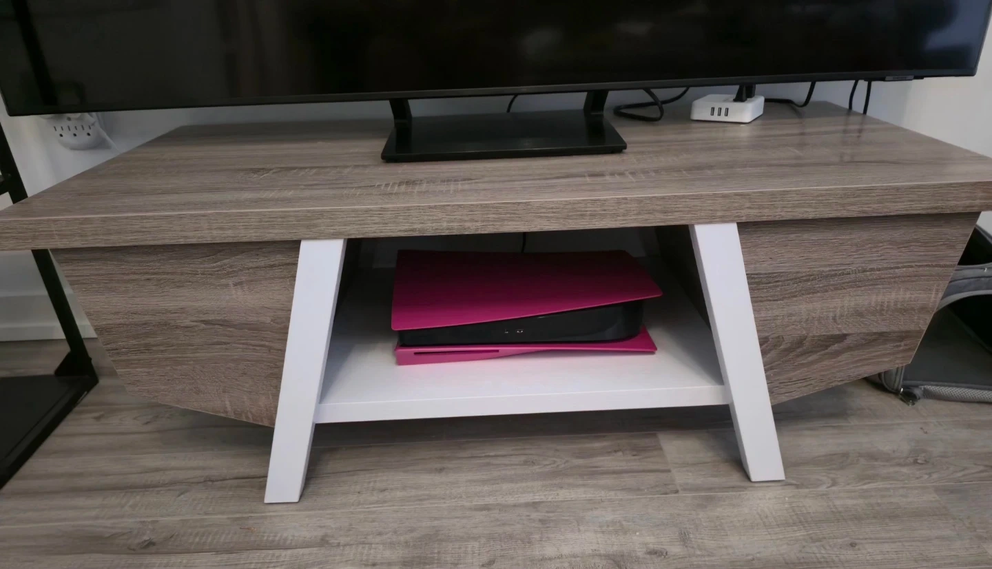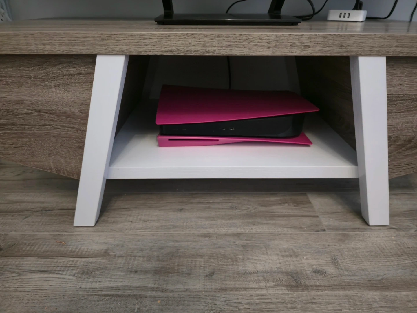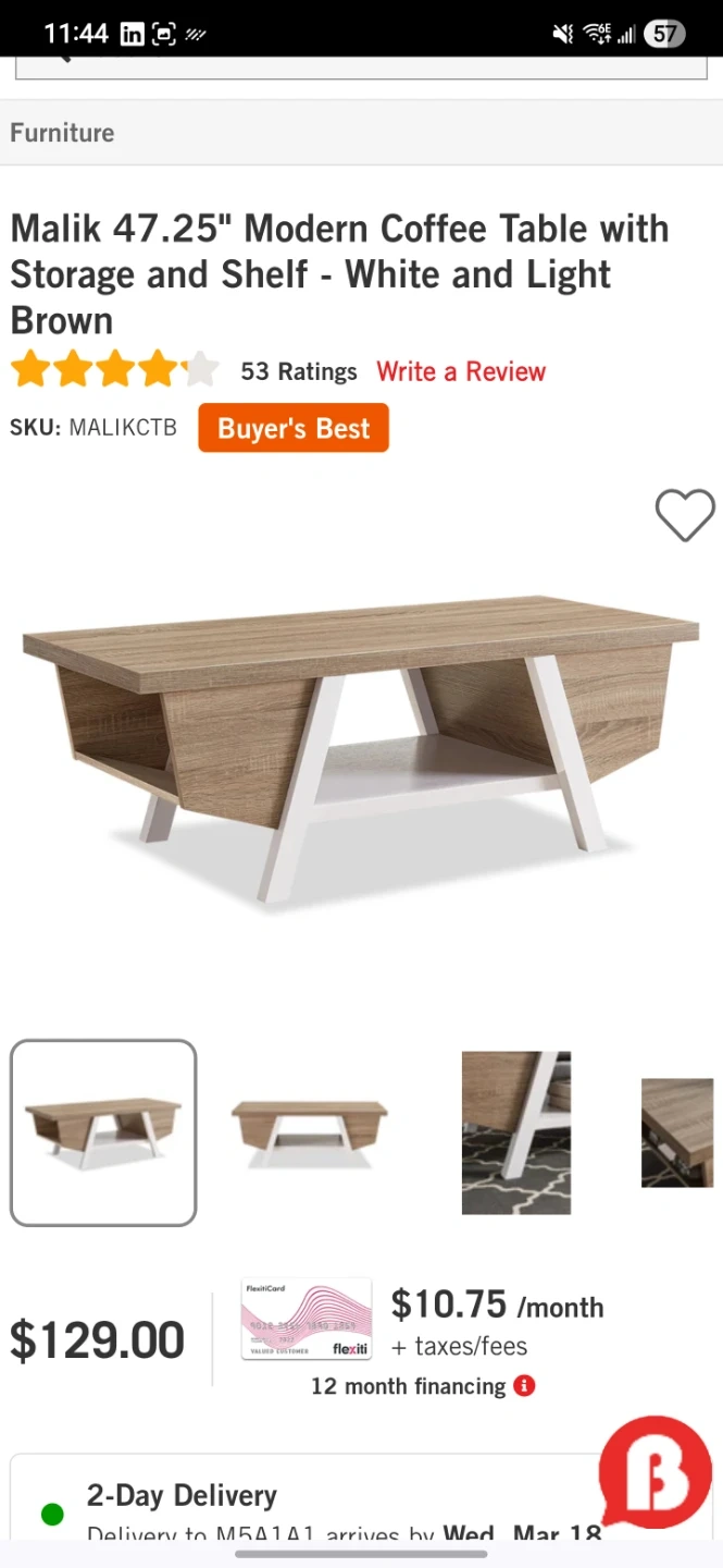 This coffee table features a modern design with a light brown wood grain finish and white accents. It offers open shelving for storage. Made with durable materials.
