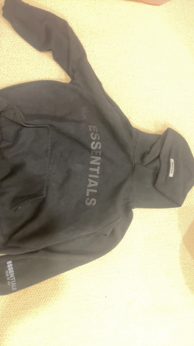 Black hoodie with Essentials logo on the front and Essentials Fear of God on the sleeve. Comes with the original packaging.
