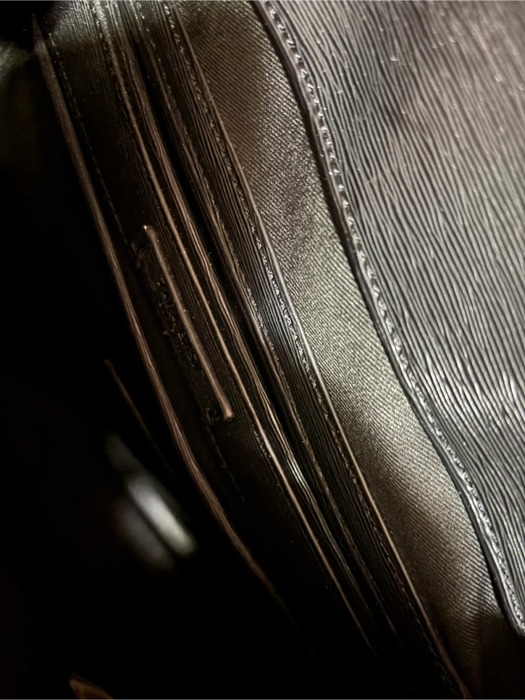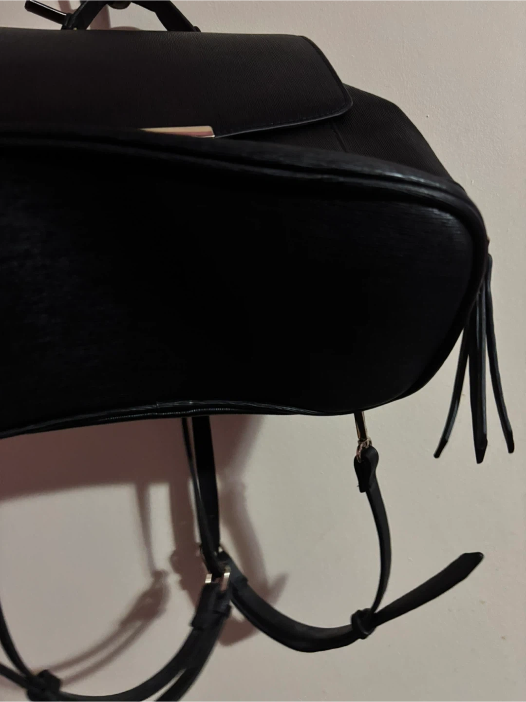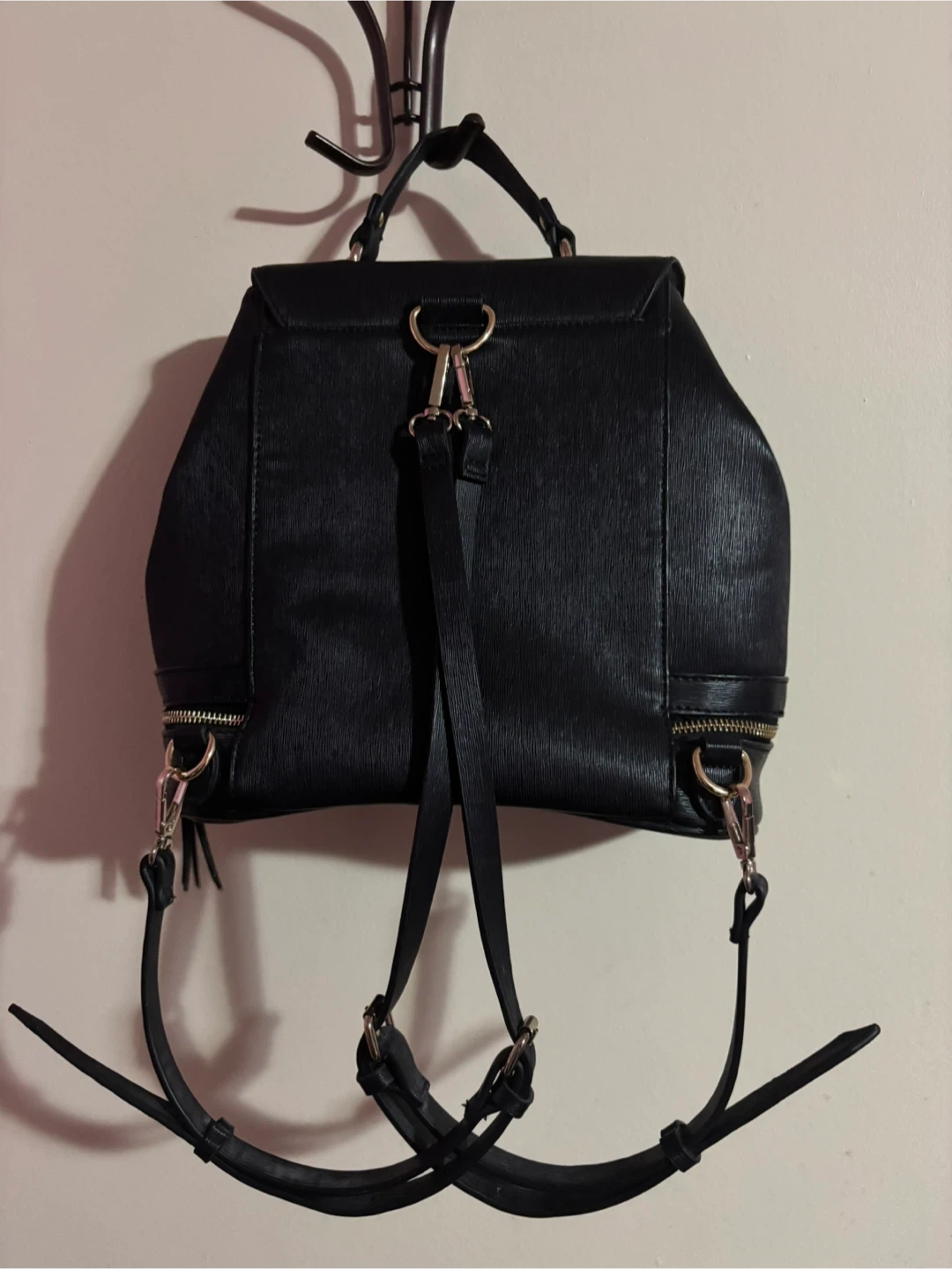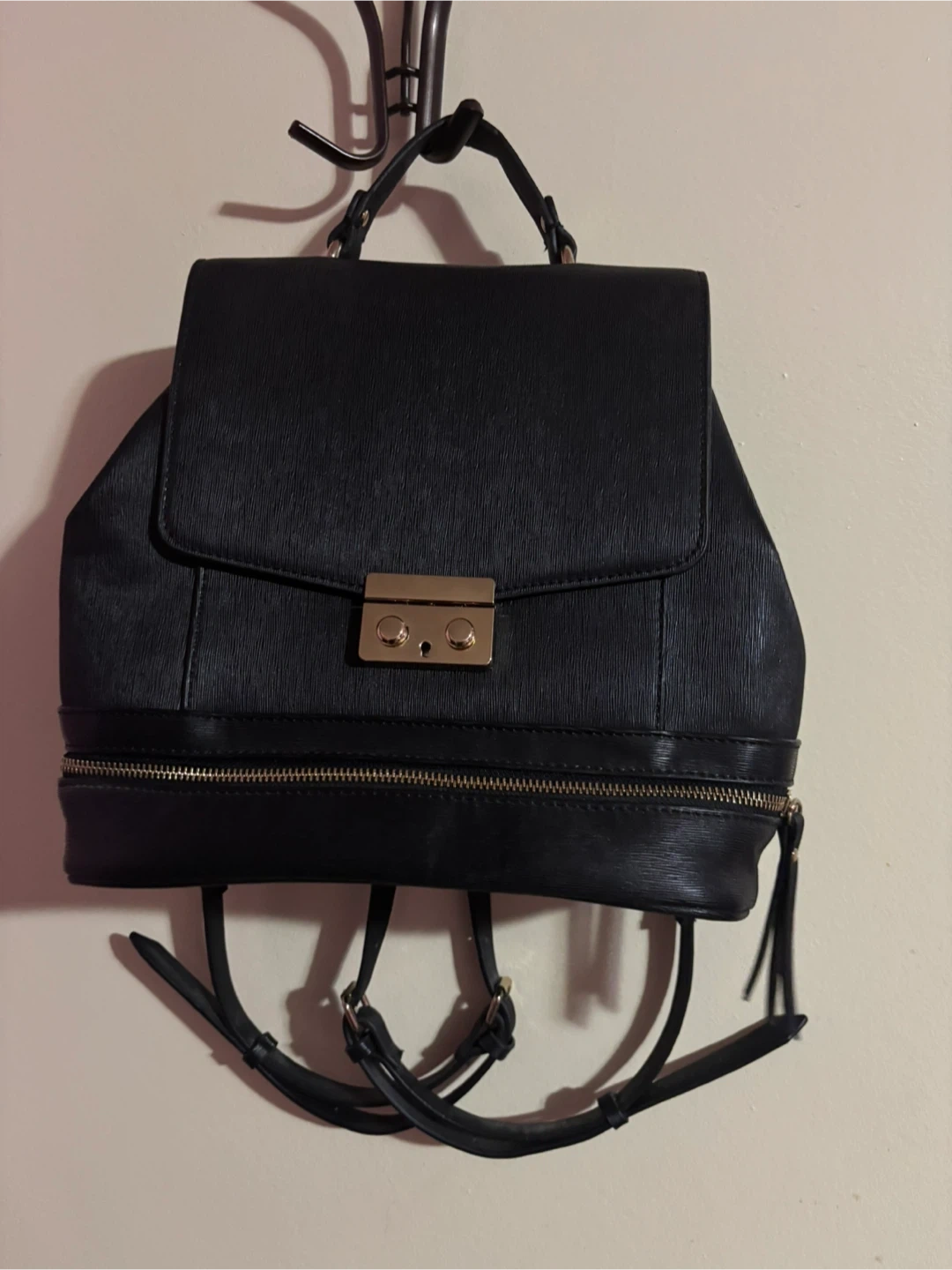 This black faux leather backpack has a textured finish and gold hardware. It features an exterior zip pocket and adjustable straps. Interior has card slots and a zip pocket.