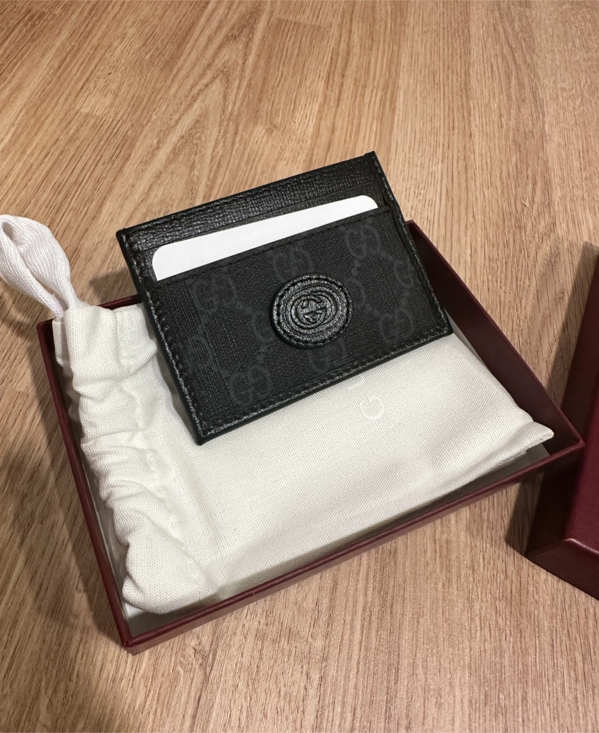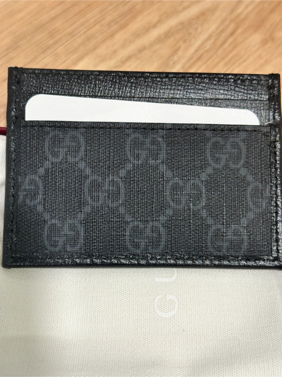 This is a Gucci card holder in black GG Supreme canvas. It comes with its original Gucci box and dust bag. The holder has multiple card slots.