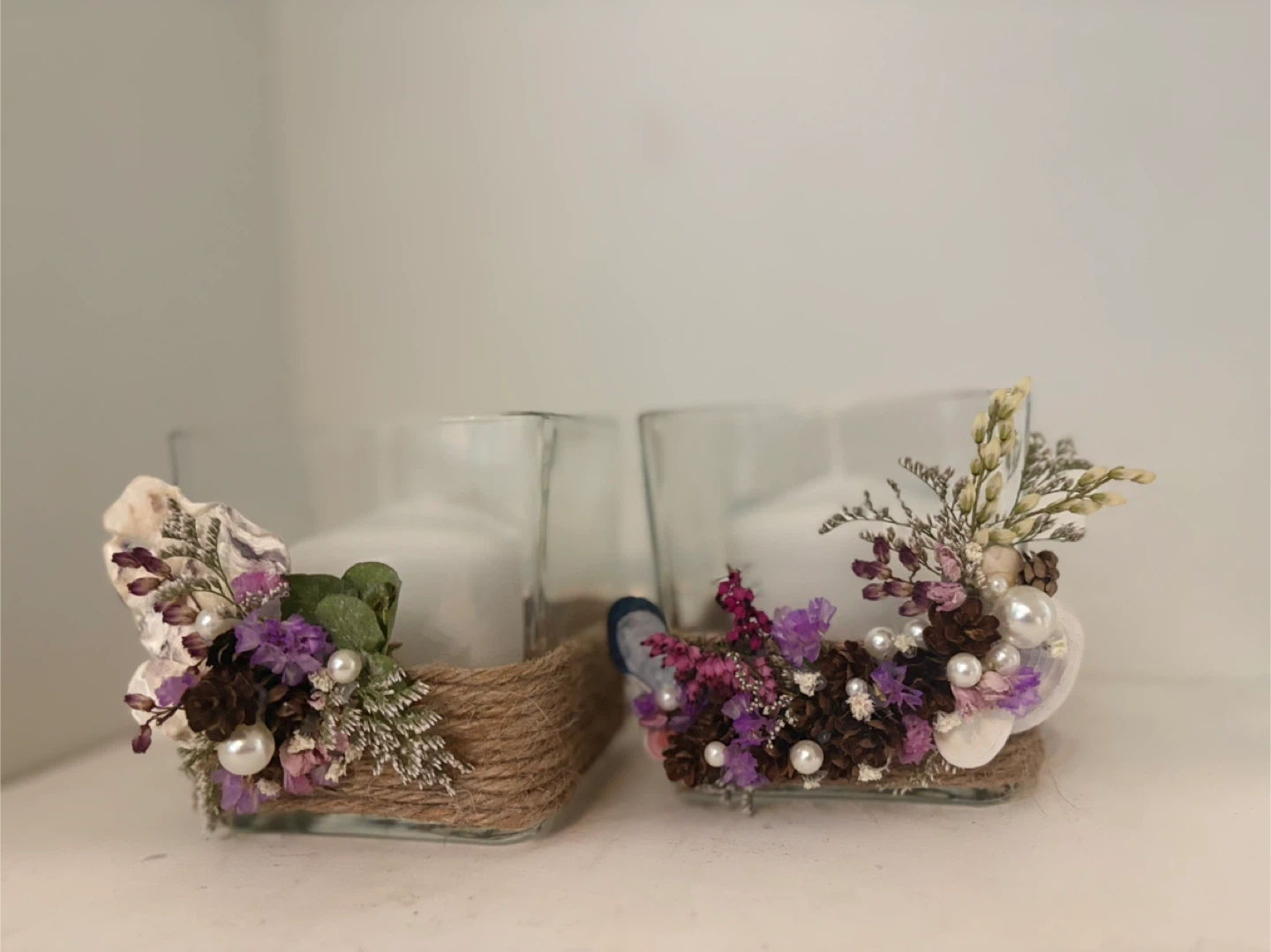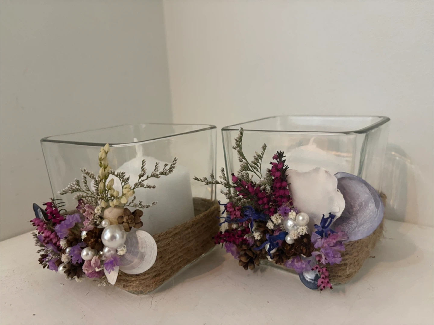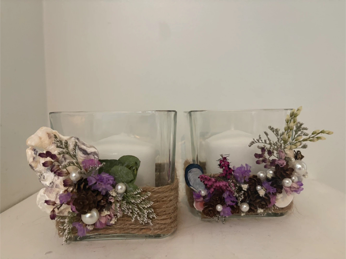 A set of two clear glass candle holders, each adorned with dried flowers, pinecones, seashells, and pearls. Each holder comes with a white pillar candle. These decorative pieces add a rustic and charming touch to any space.