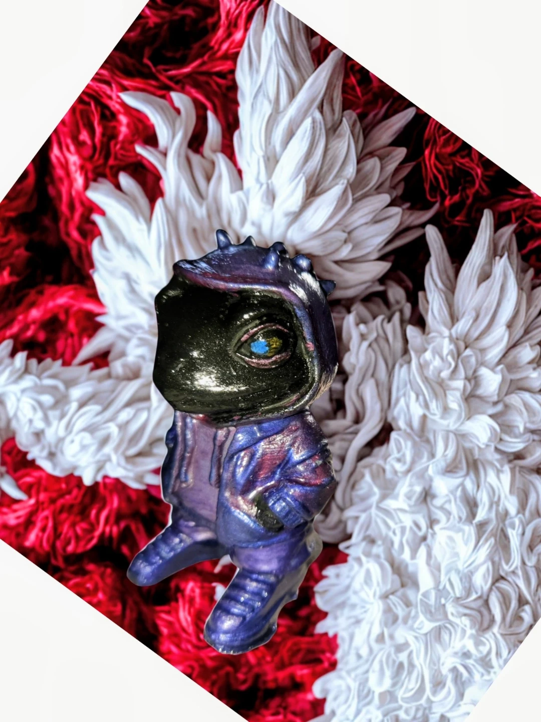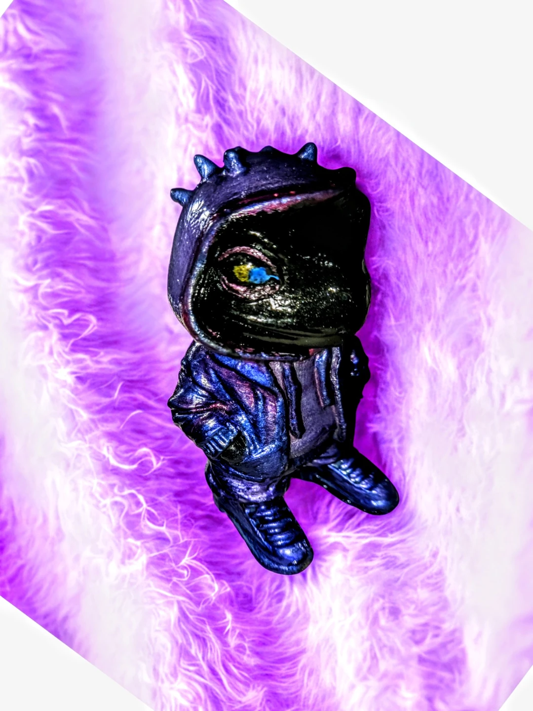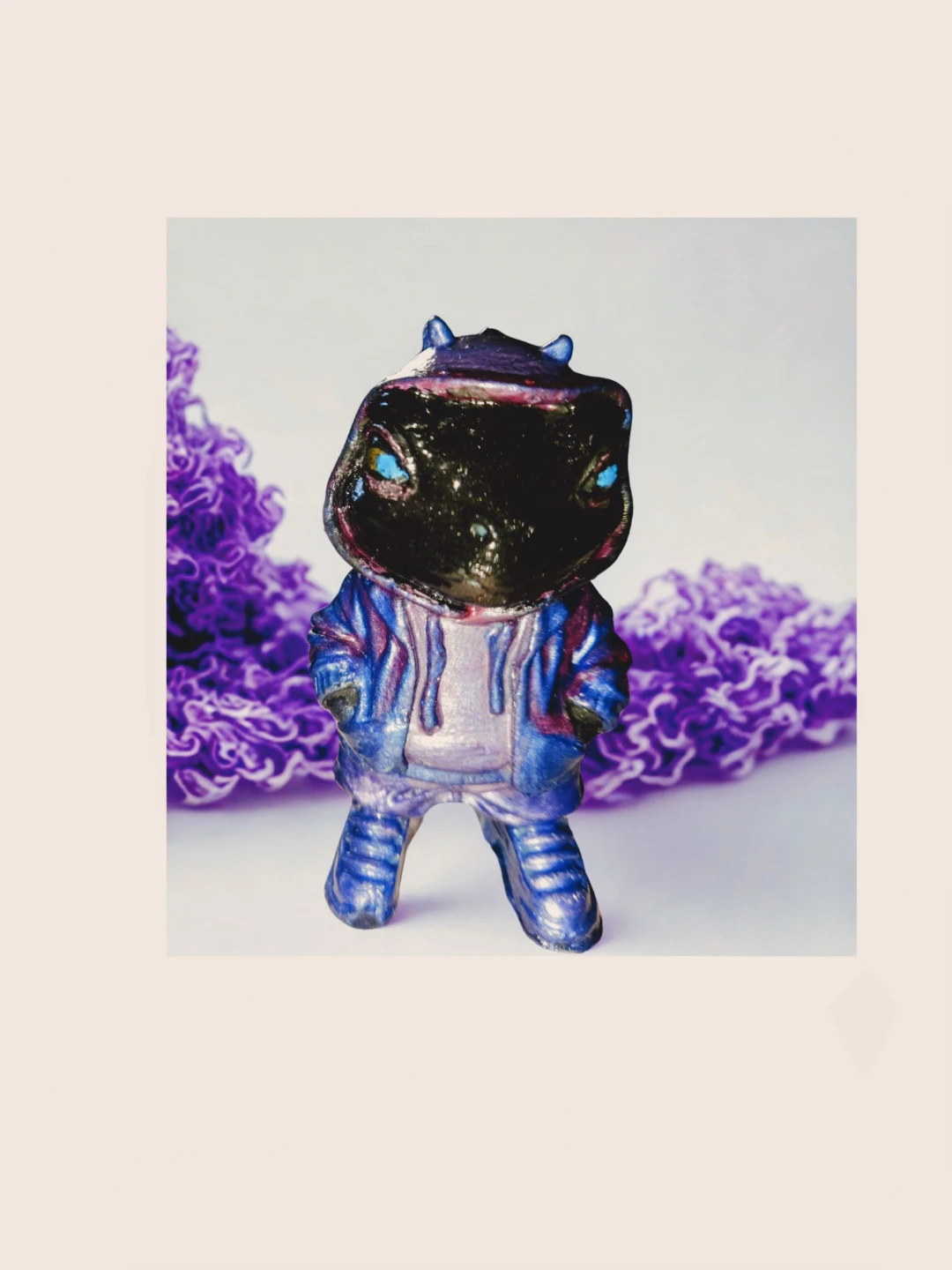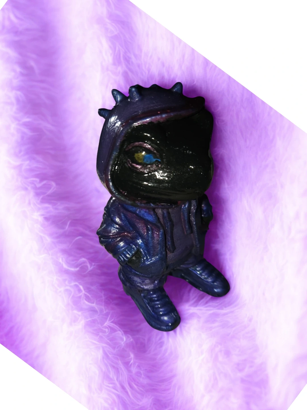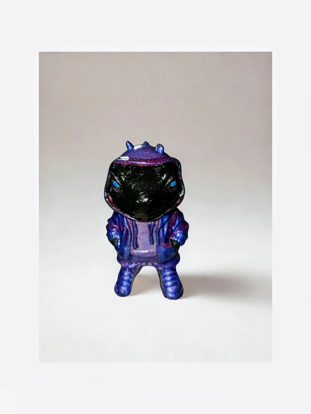 Figurine peinte à la main, représentant un personnage stylisé avec un capuchon et un pantalon. Les yeux sont bleus et la finition est métallisée violette et bleue.