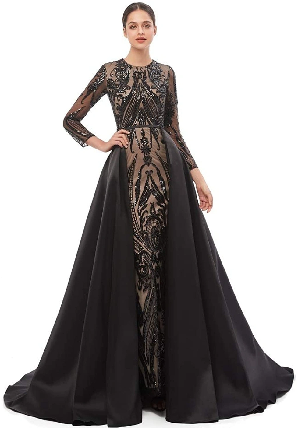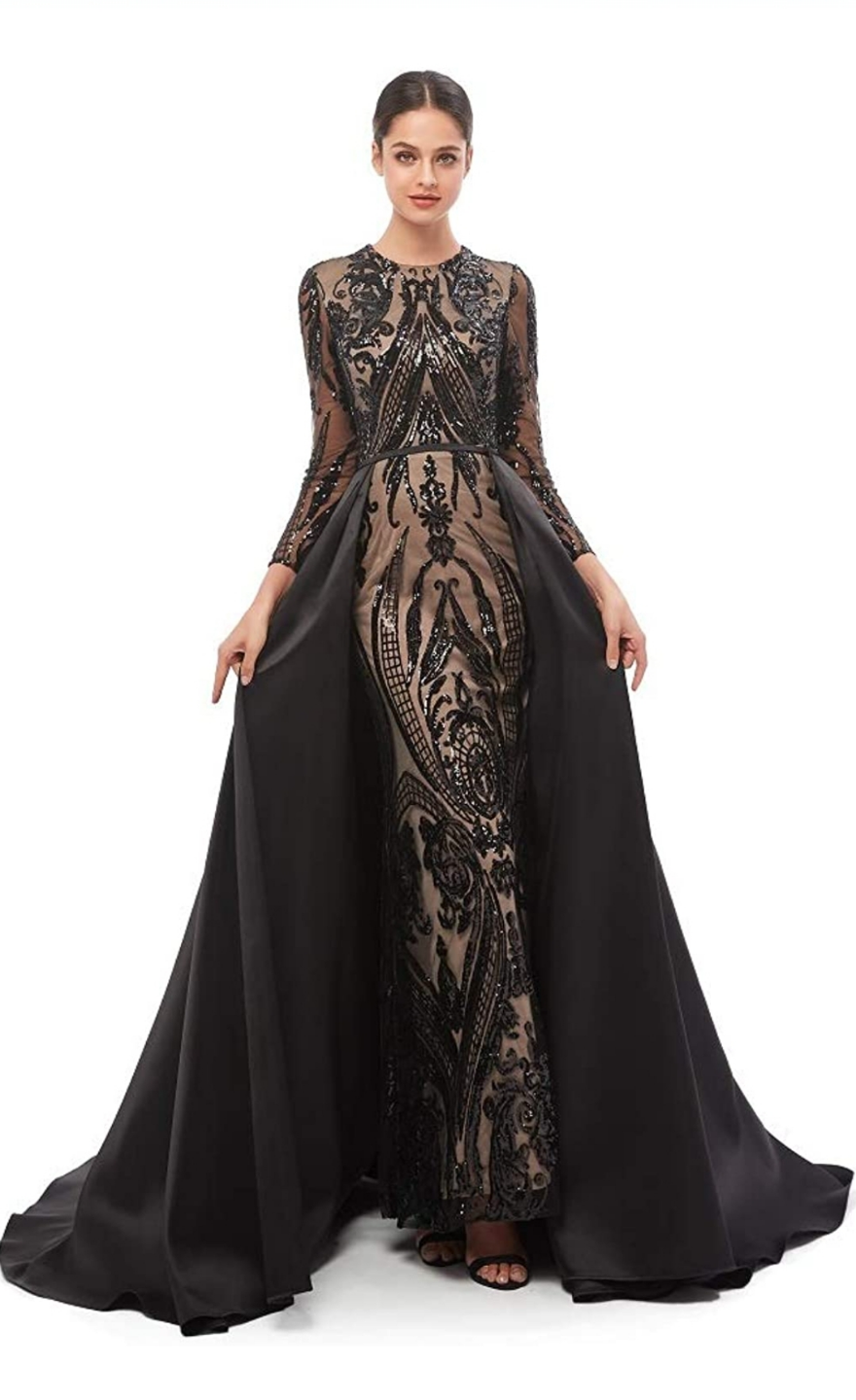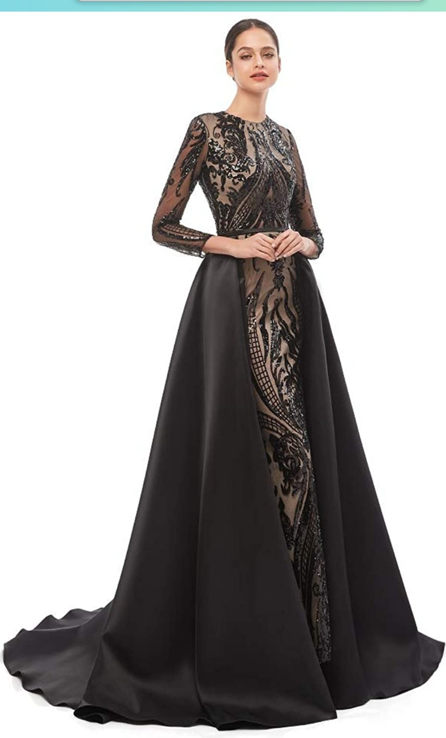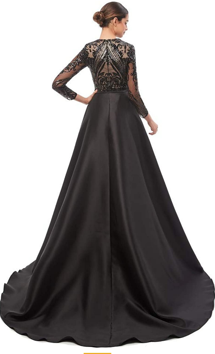 Brand New. Stunning floor-length gown. Features a fitted sequin bodice with long sleeves and an overlay satin skirt. Perfect for a special occasion.