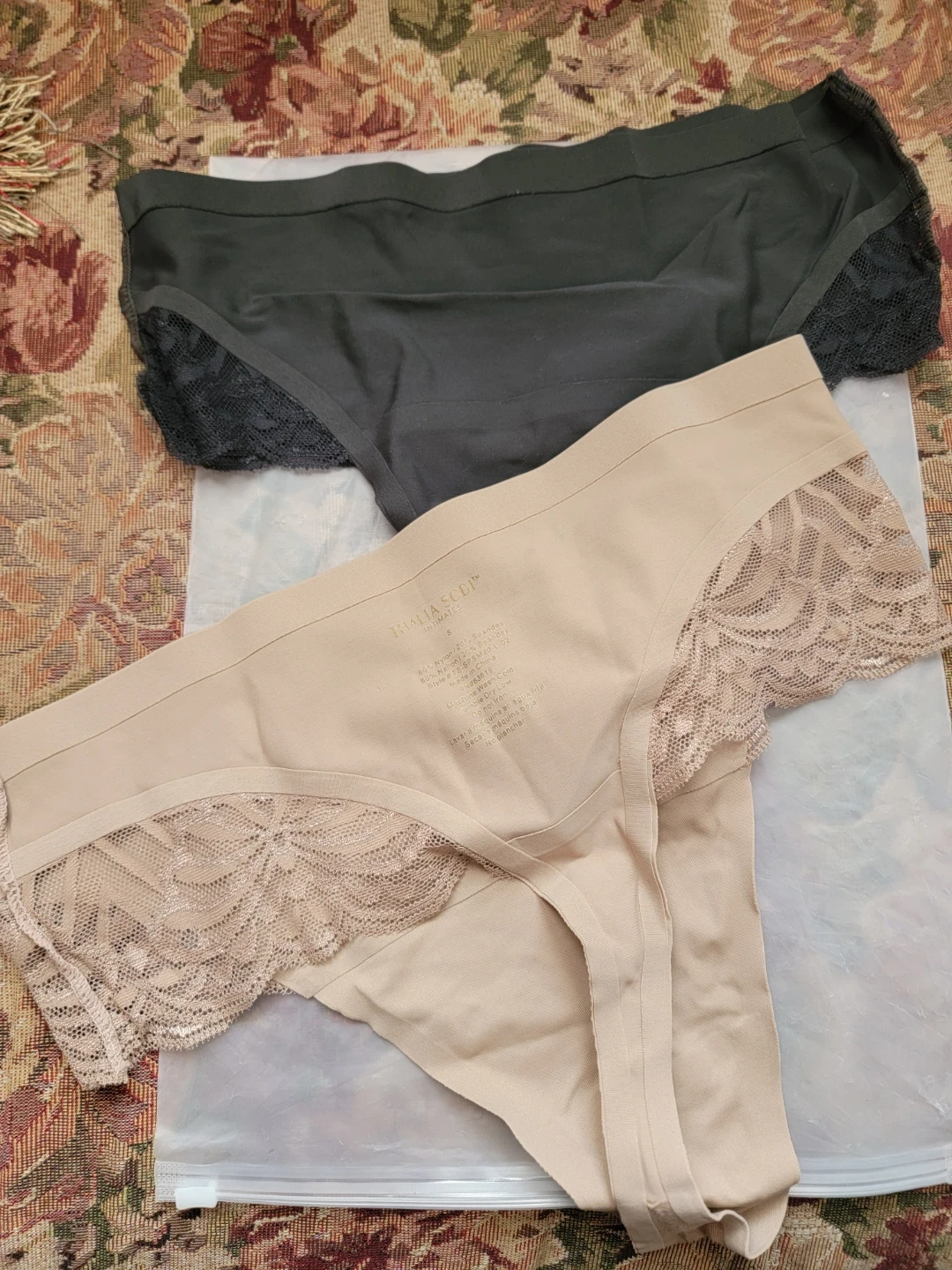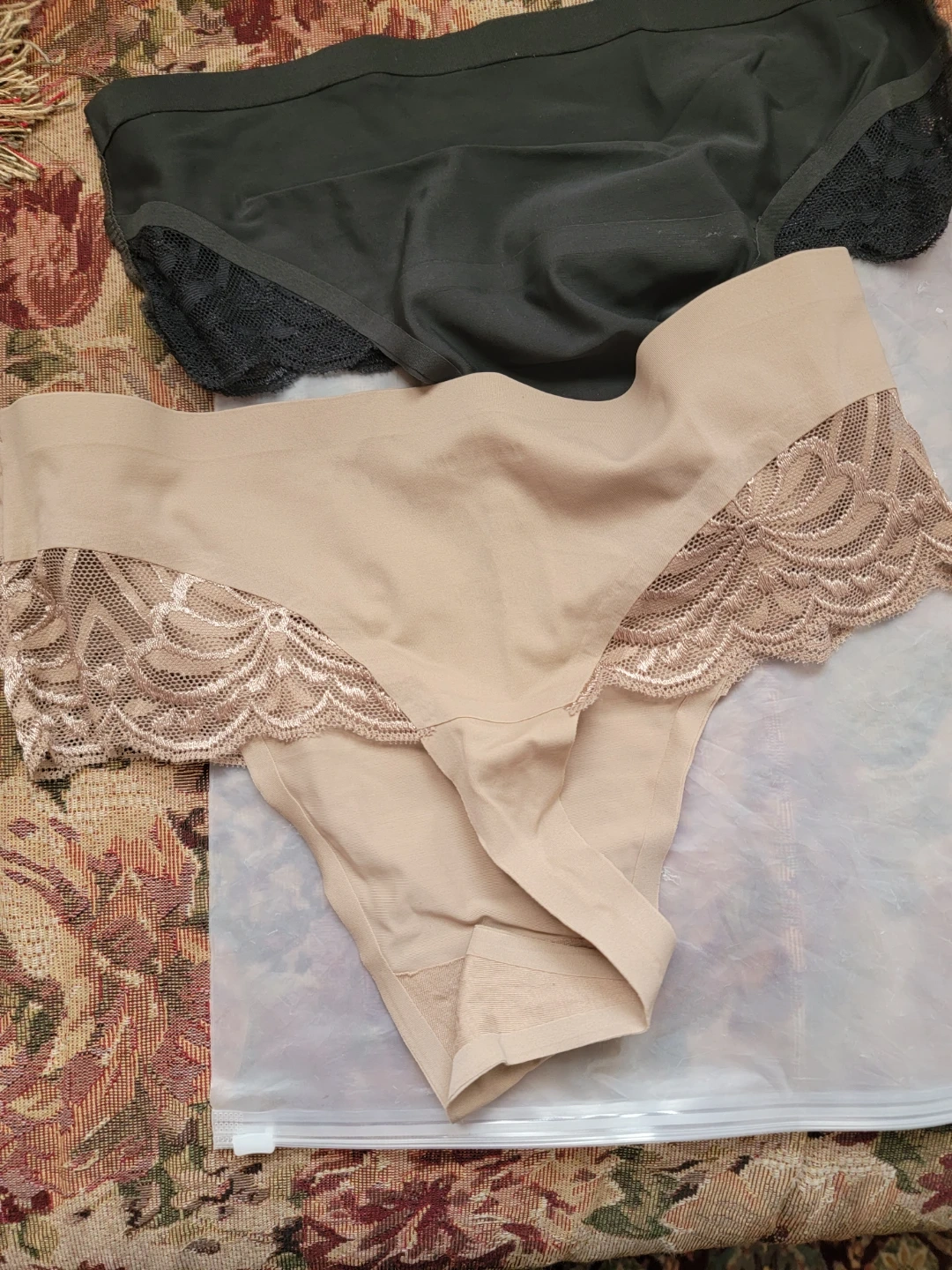 Two pairs of comfortable underwear, one tan and one dark grey. They feature a no-show lace trim design for a smooth look under clothing. Made with soft, stretchy material for all-day wear.