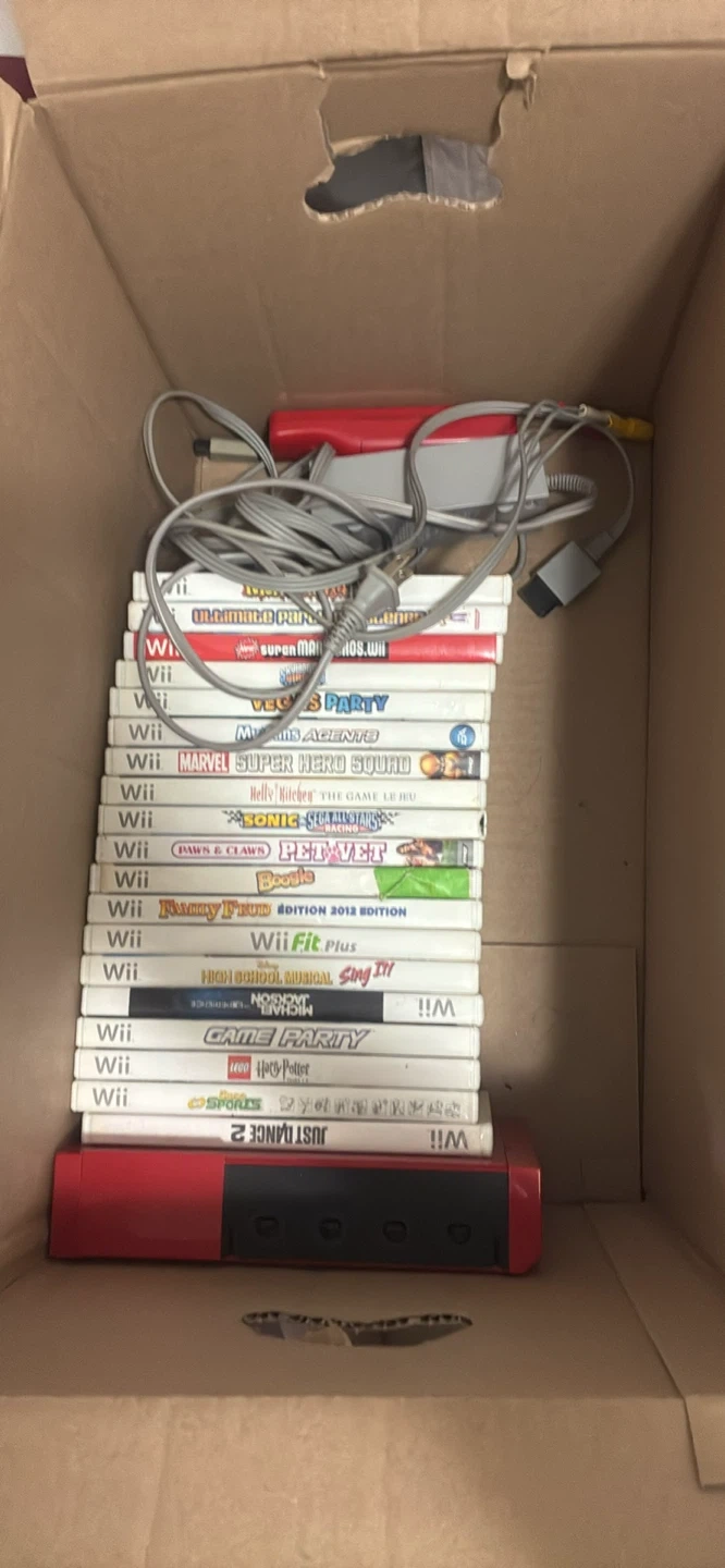 Bundle of Nintendo Wii games including Wii Sports, Super Mario Bros., Vegas Party, Marvel Super Hero Squad, and more. Also includes Wii Fit Plus and Just Dance 2. Comes with necessary cables and a red Wii controller accessory.