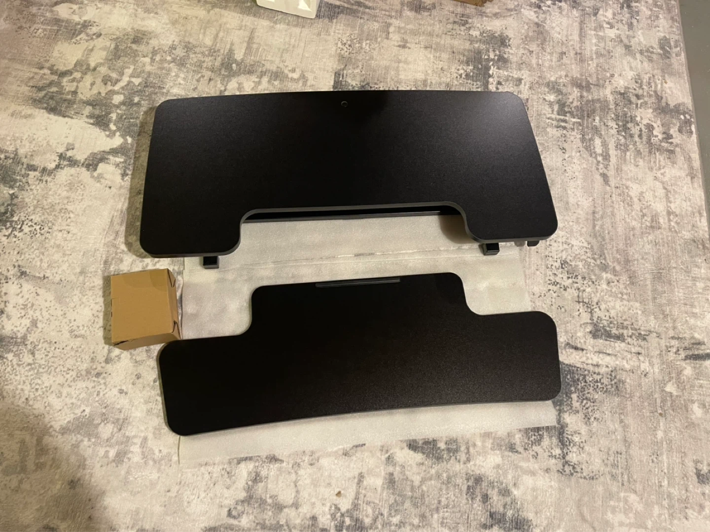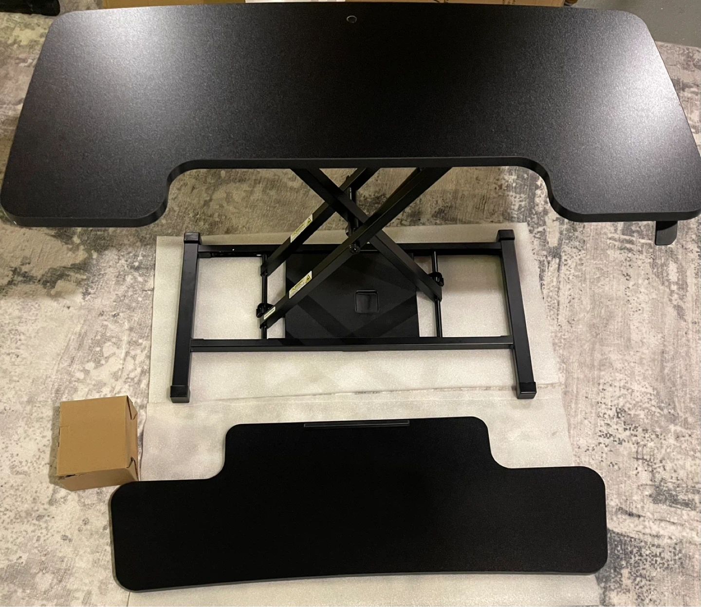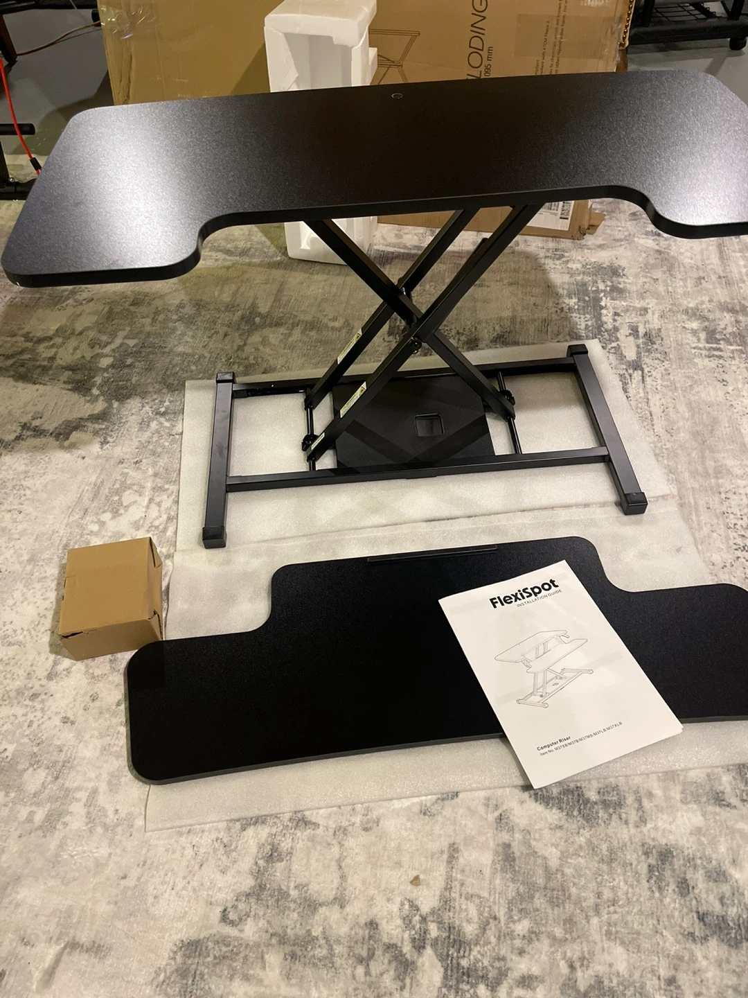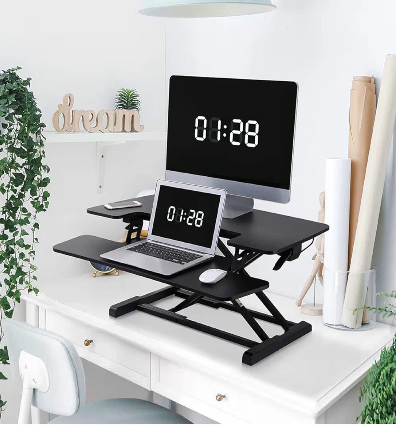 This black standing desk converter from FlexiSpot allows you to switch between sitting and standing. It's designed with a two-tier system for monitor and keyboard/mouse placement. Some assembly is required, and it includes instructions.