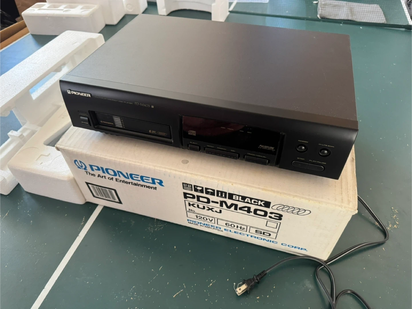 This is a Pioneer PD-M403 multi-play CD player. It's black and runs on 120V, 60Hz. This player was made in Japan. It's a compact disc player.