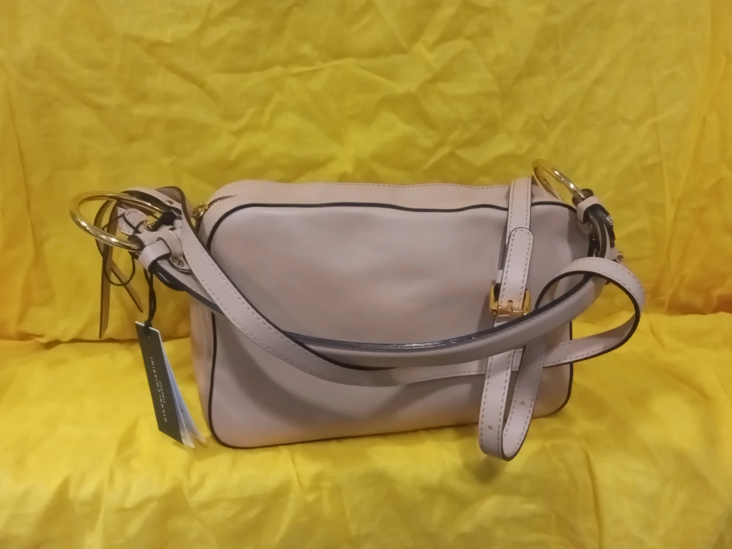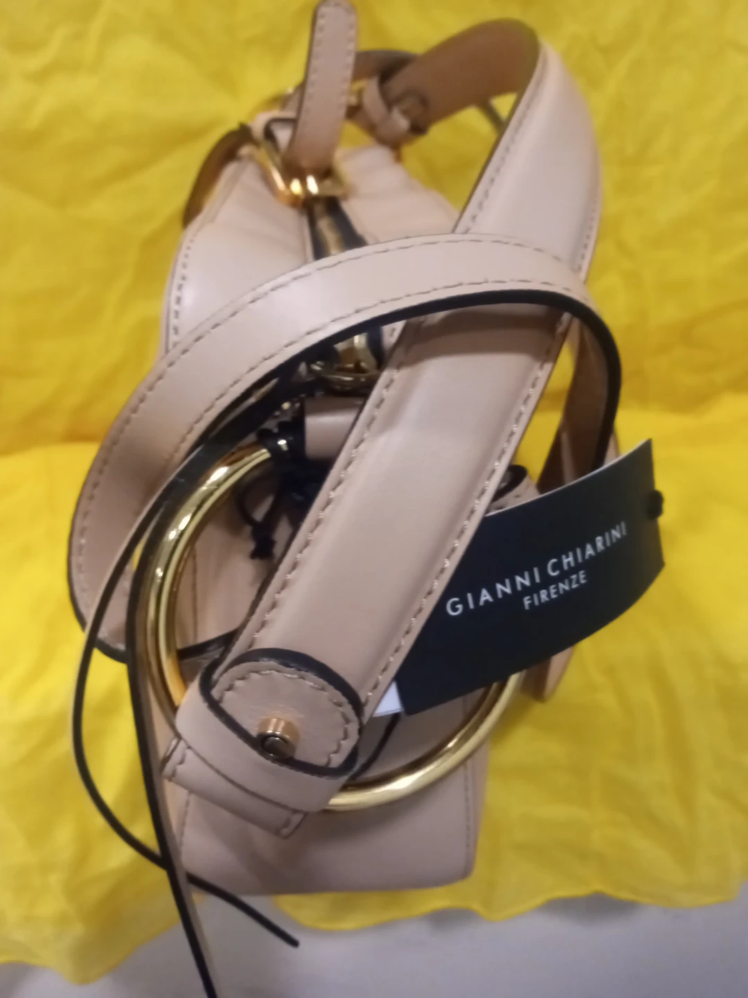 This Gianni Chiarini Firenze shoulder bag is made in Italy. Soft leather it features a taupe-coloured leather exterior with gold hardware. Includes a detachable strap for versatile wear. Great for everyday use!