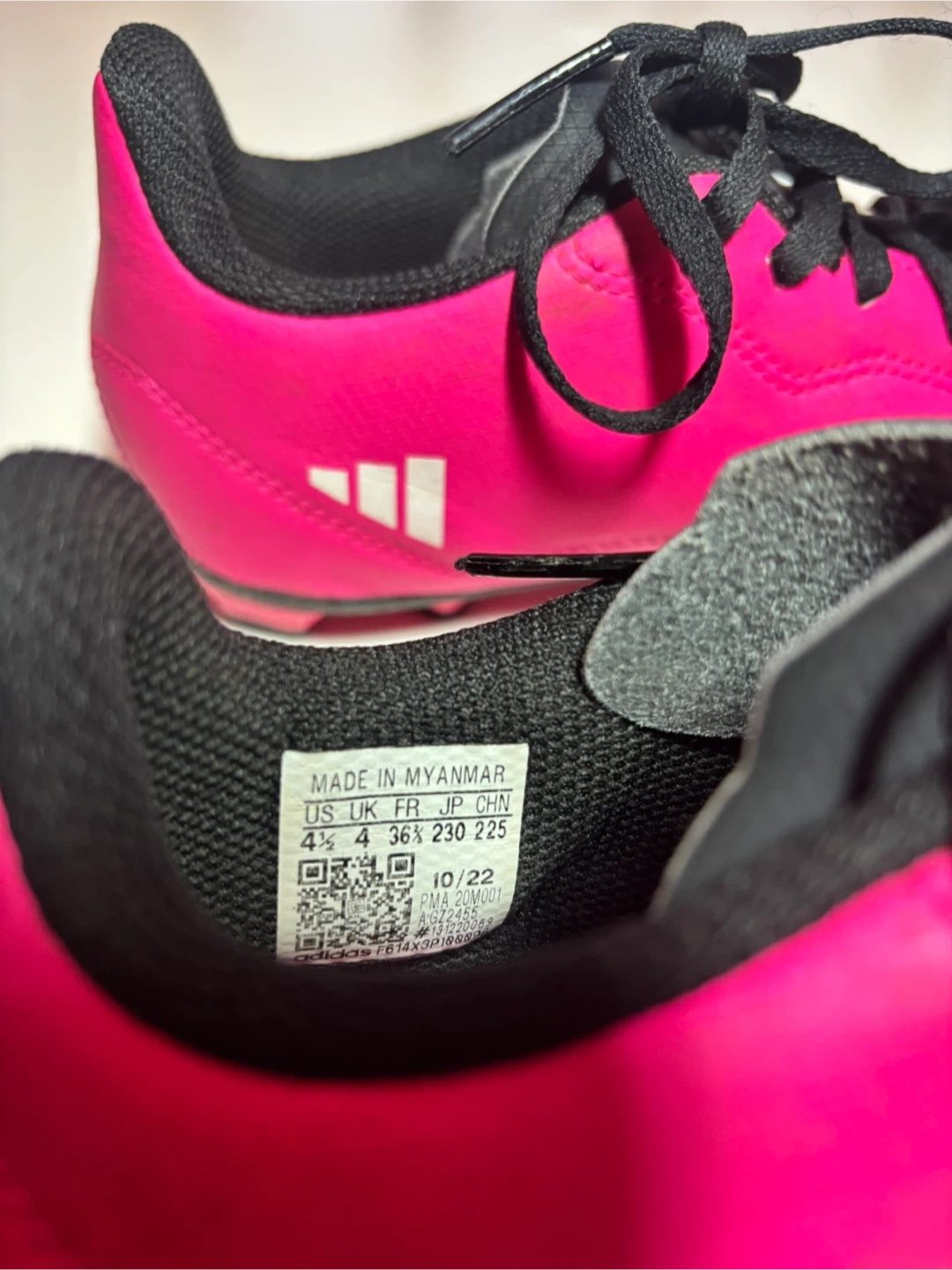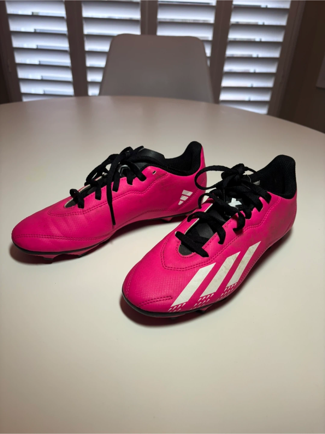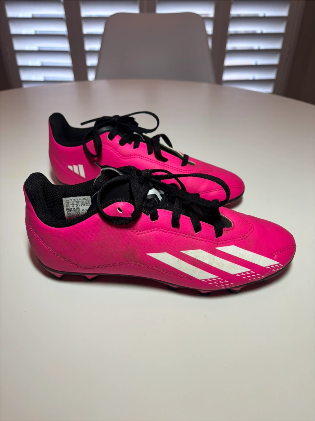 Adidas pink soccer cleats. Size is US 4 youth. These cleats are great for playing soccer on turf or grass!