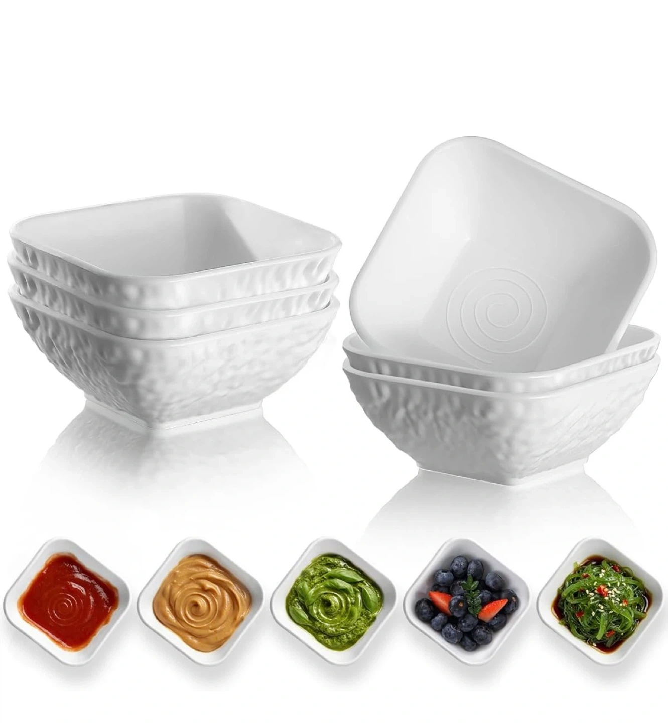 Set of six white square textured bowls. Each bowl has a normal capacity of 5 oz and a maximum capacity of 7 oz. They measure 9.5 cm by 5 cm with a height of 4 cm. Perfect for serving dips, sauces, or small appetizers!