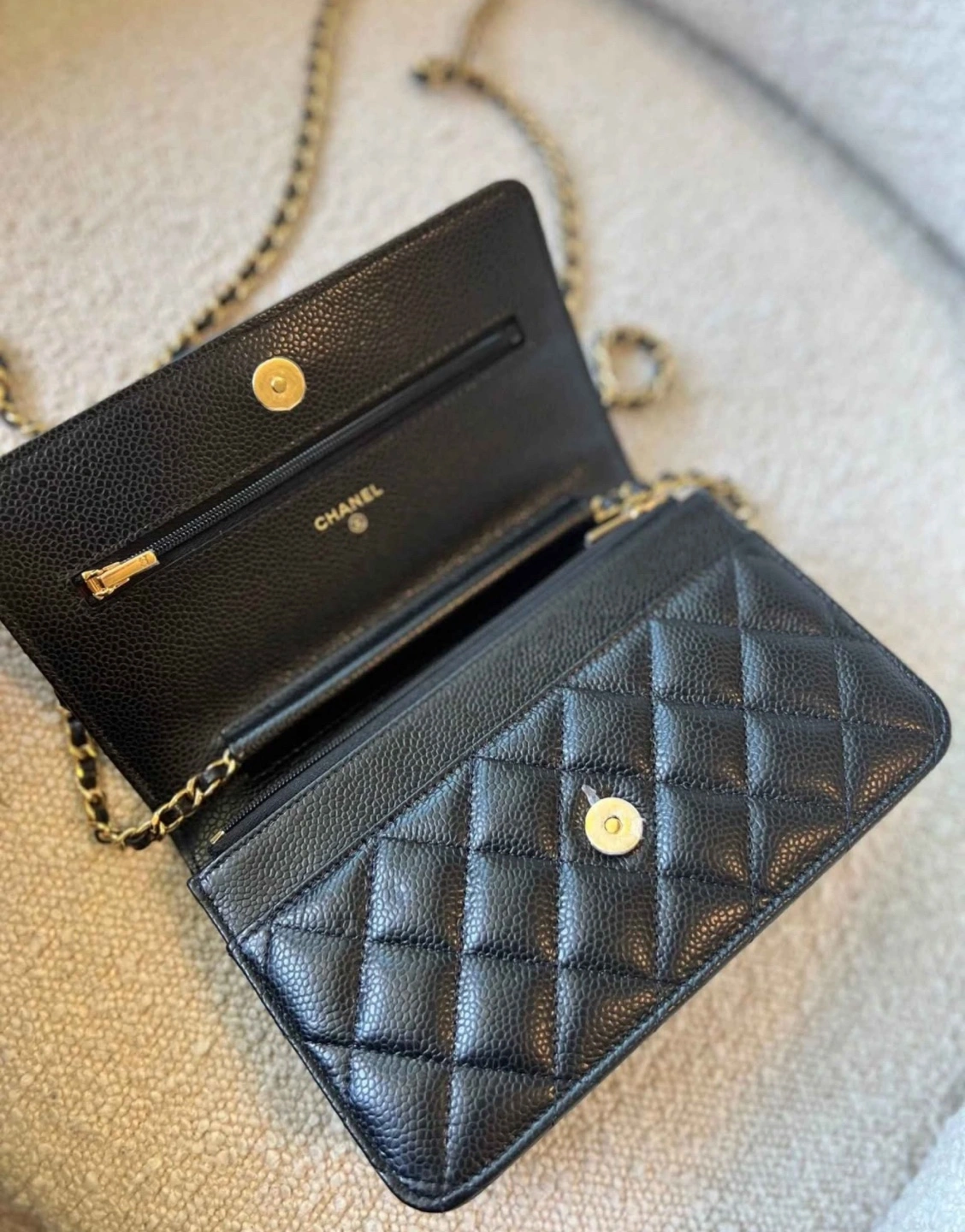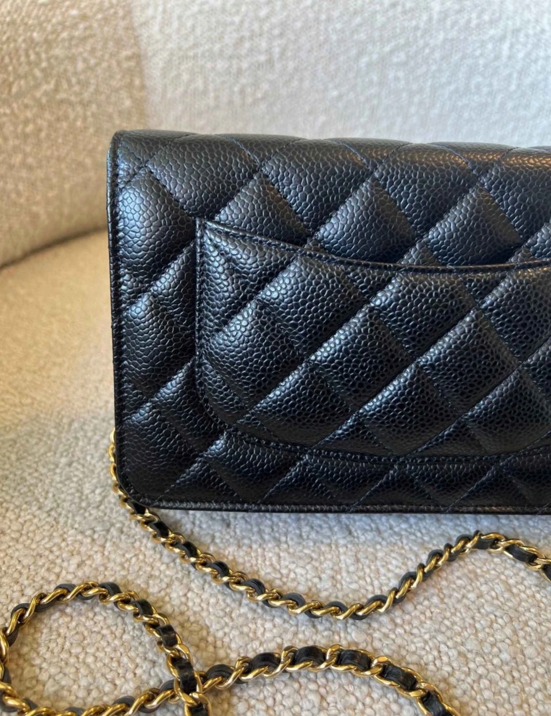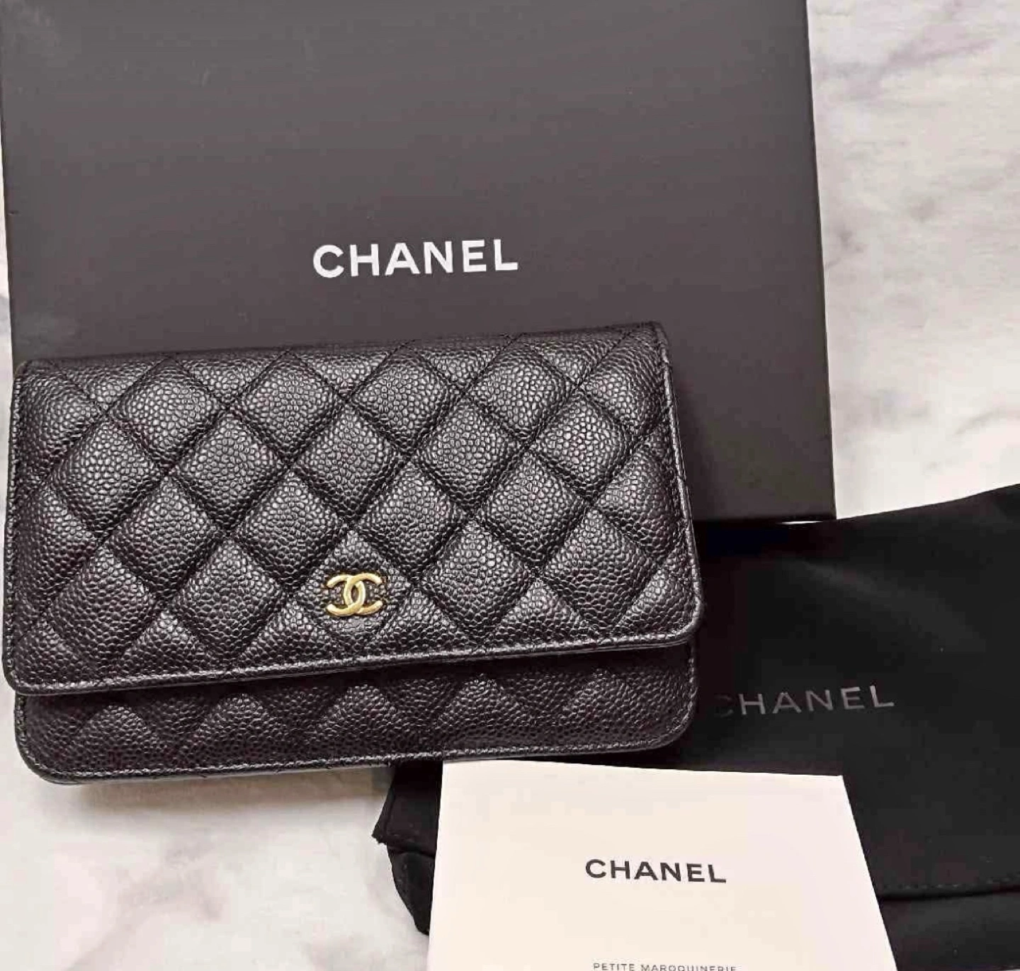 Classic Chanel wallet on chain. Black caviar leather. Gold-tone hardware. Multiple card slots and compartments. Includes box and dust bag. Was bought for almost $5000. Have receipt and everything needed!