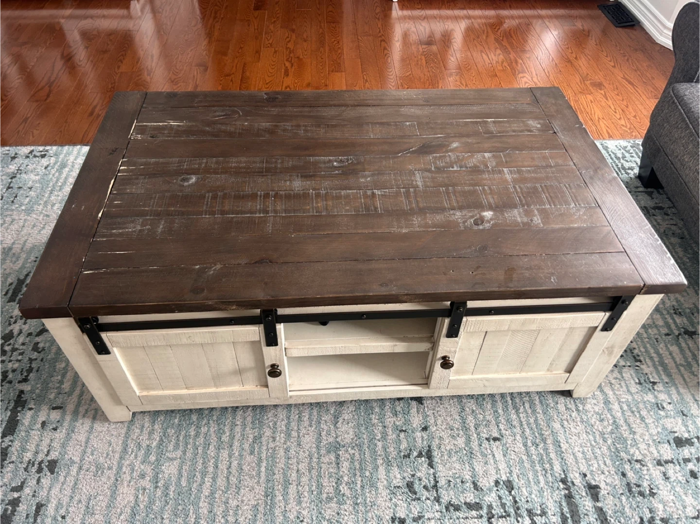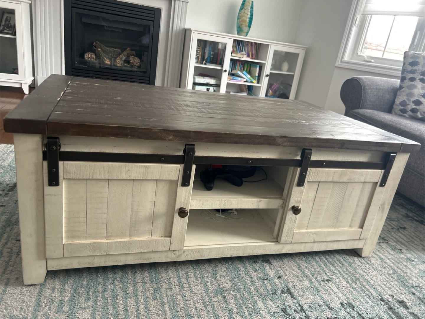 This coffee table features a rustic farmhouse design with a dark wood top and a distressed white base. It includes sliding barn doors that conceal storage space. The open shelf in the centre is perfect for displaying items or keeping electronics handy.