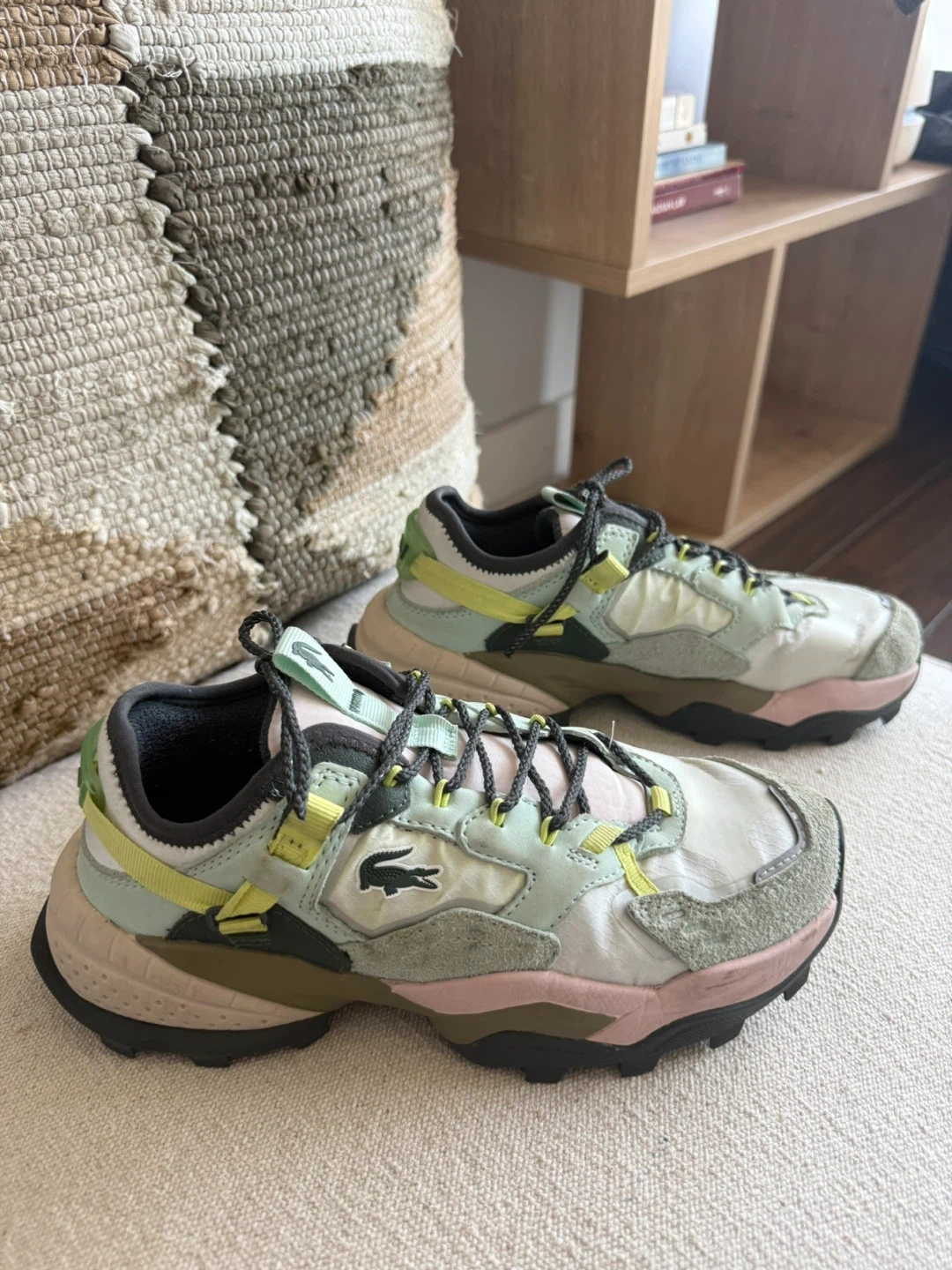 These Lacoste sneakers are a cool blend of mint green, pastel pink, and beige tones. They feature a durable rubber sole for great traction. extremely light and comfy