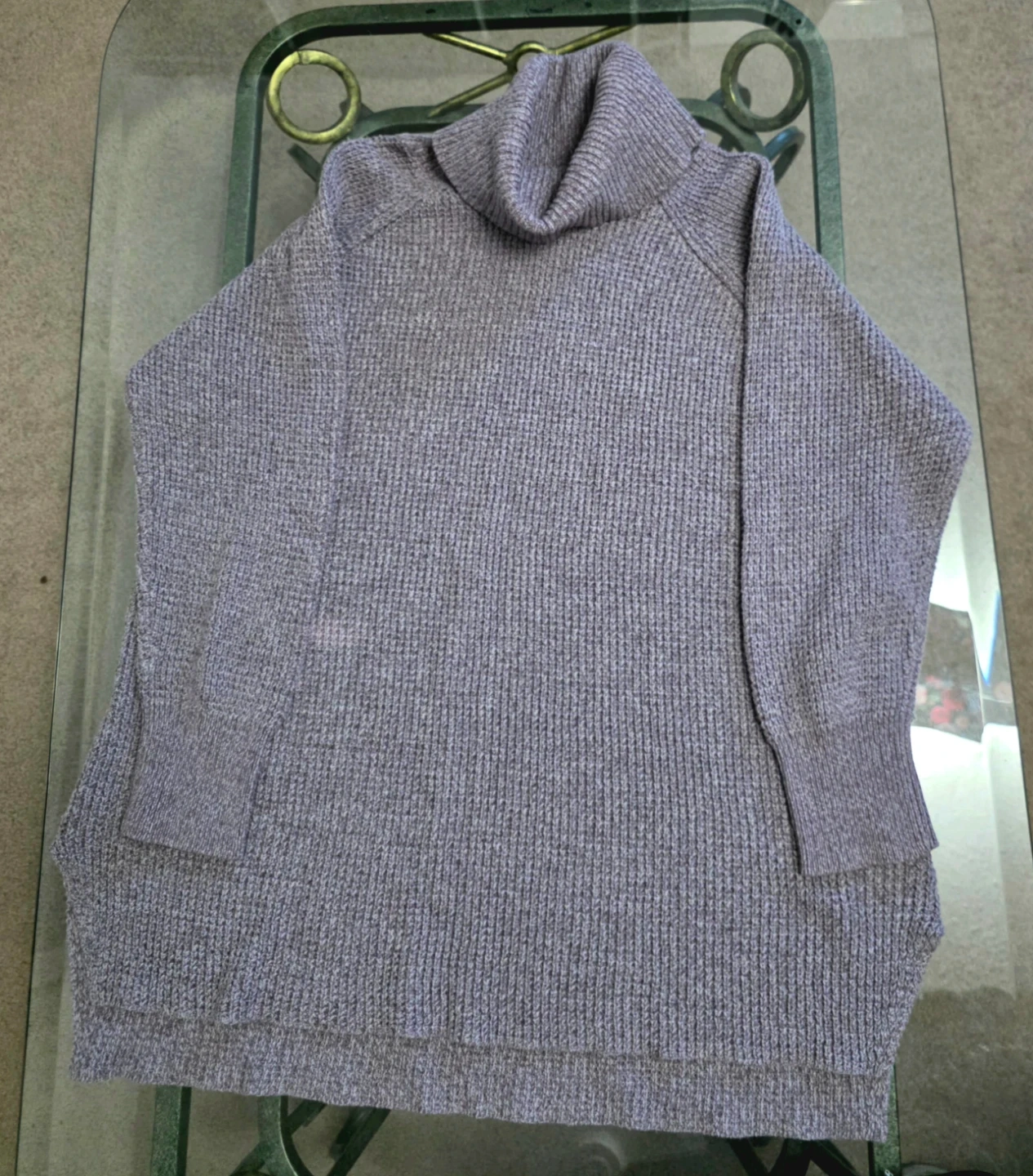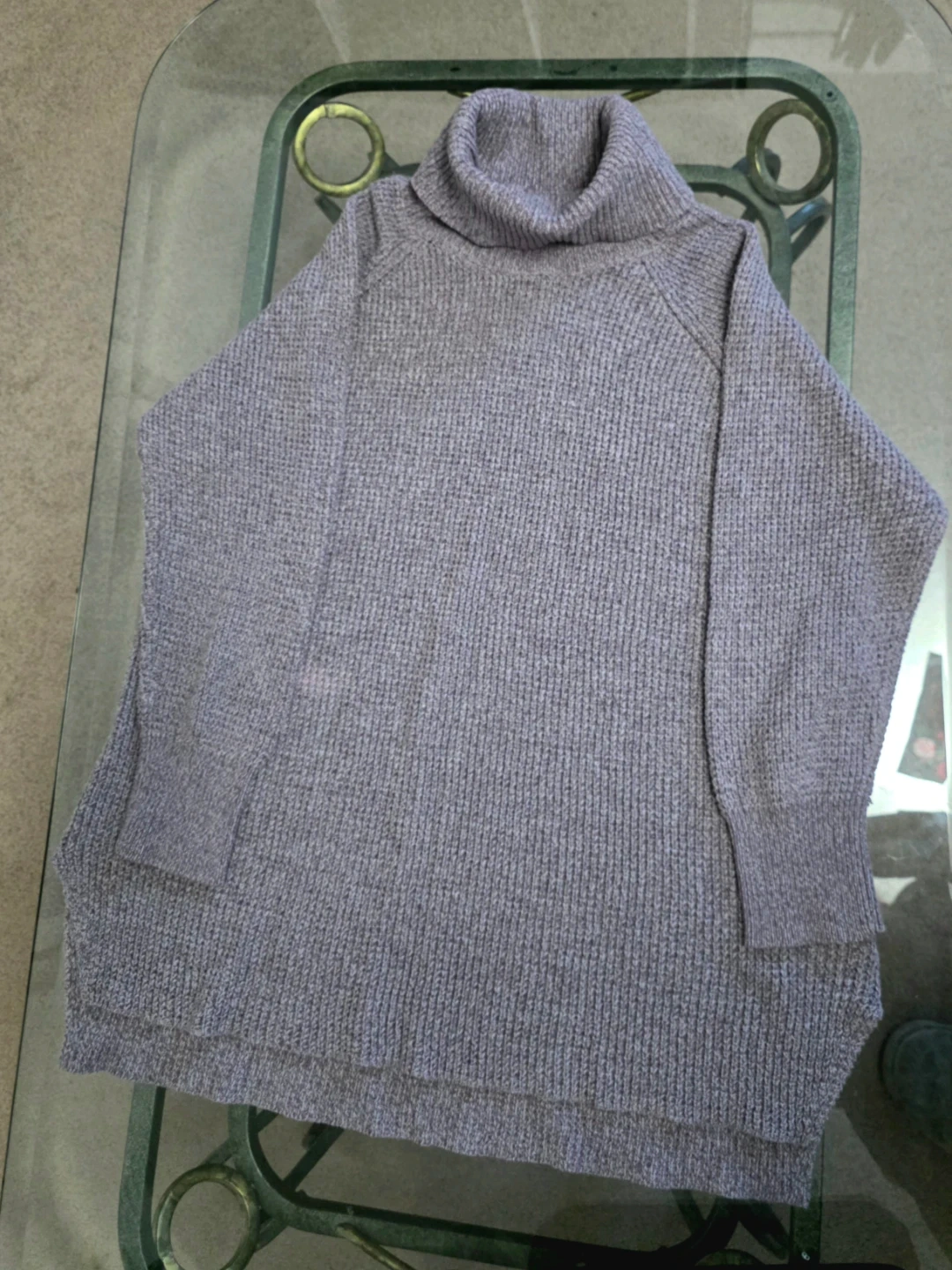 ​Style: Beautiful heathered light purple/mauve chunky knit sweater. Features a warm, relaxed turtleneck and a flattering high-low hem (slightly longer in the back for extra coverage).
