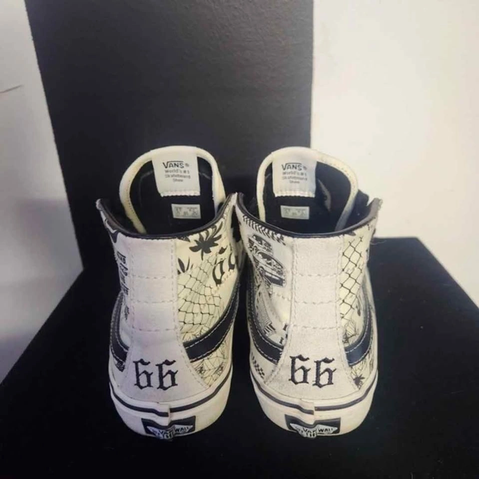 White canvas with black laces and black graphic designs. Has '66' on the back and car patterns on the sides. Black and white design.