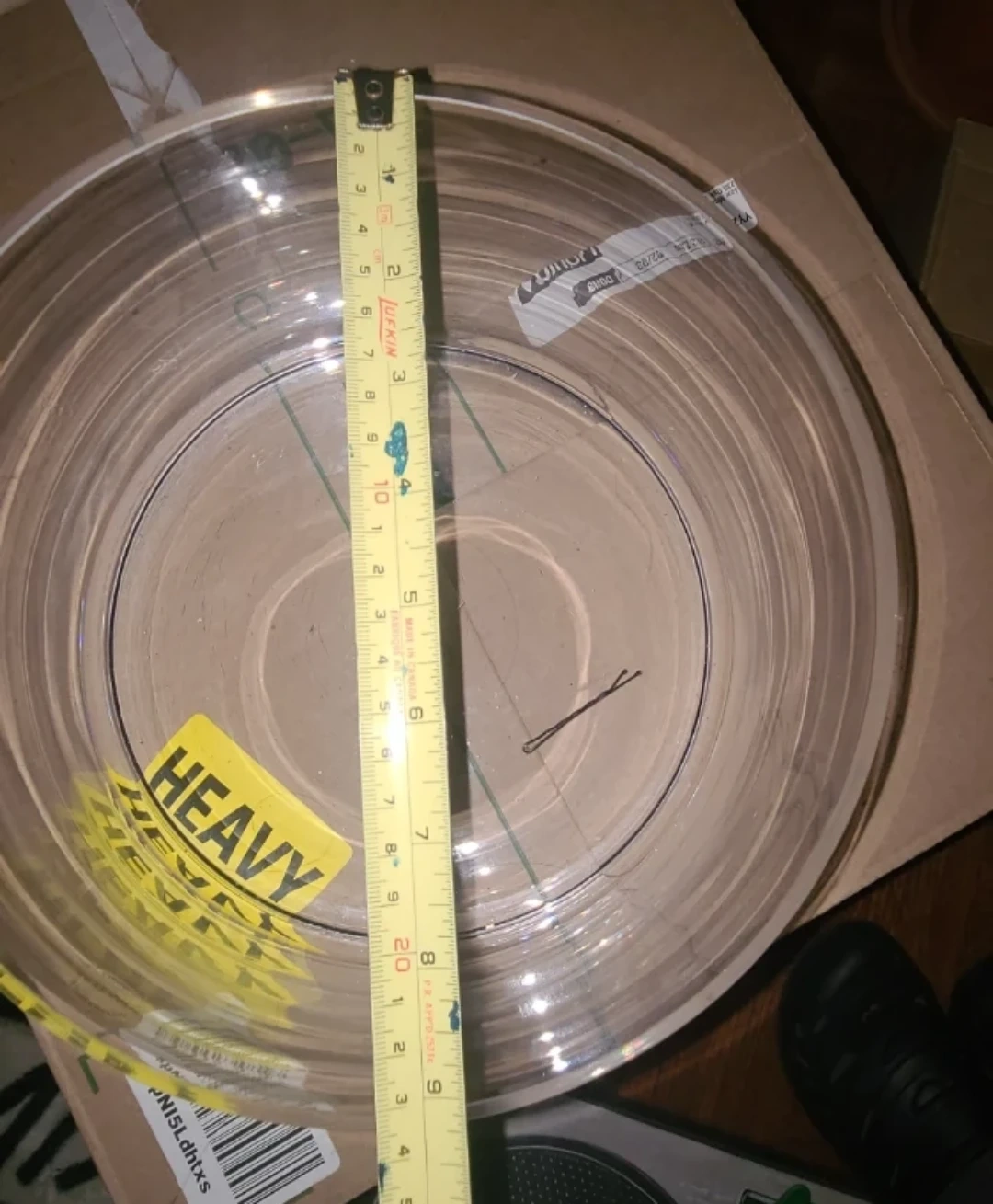 This is a clear glass bowl, hand-crafted by Artland. It measures 15 inches in diameter and 5.5 inches in height. It's suitable for serving or as a decorative piece.