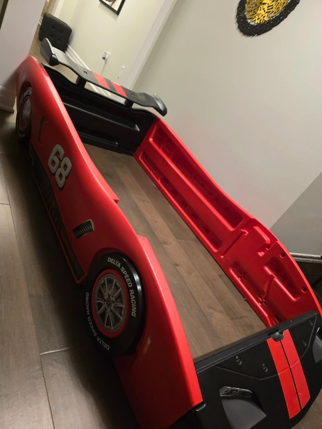 Red and black toddler bed shaped like a race car. It features "Delta Speed Racing" text on the wheels. This bed's unique design makes transitioning to a big kid bed fun!