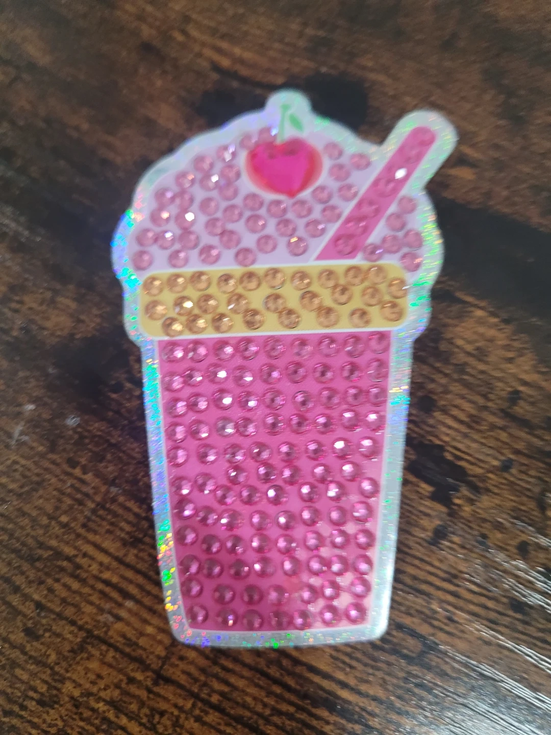 Fun sticker designed to look like a sparkly pink drink. It's decorated with pink and gold rhinestones and has a cherry on top. This sticker would be great for decorating laptops or notebooks!