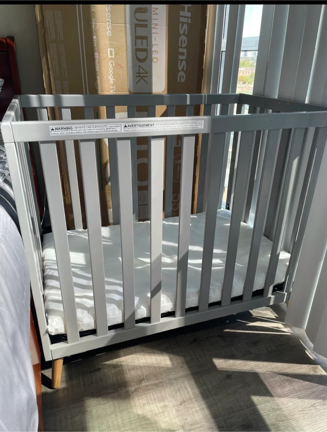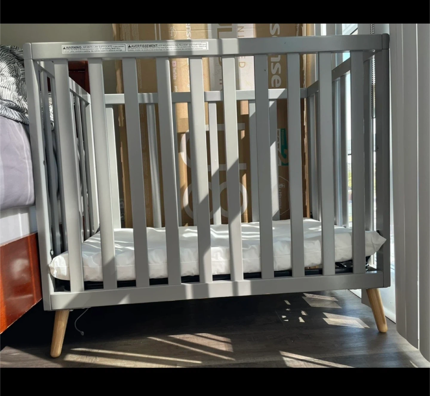 Selling a baby crib in grey from Walmart. Really very small, for newborn. 1 meter long, up to 3 years. There are some visible scratches, as shown in the pictures. The mattress is in perfect condition. Fits to small bedroom. Not a transformer, can’t be transferred to sofa.