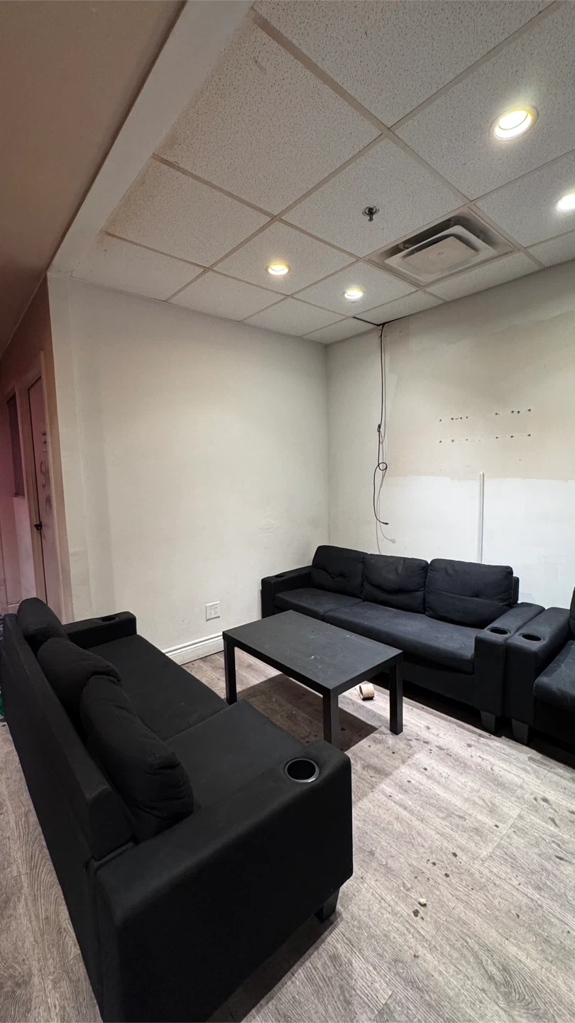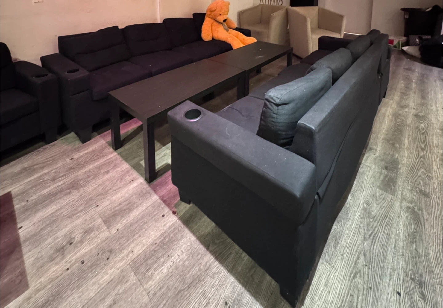 Selling a black sofa set. It's in great condition and would be perfect for a living room or common area. The set includes multiple sofas and a coffee table.