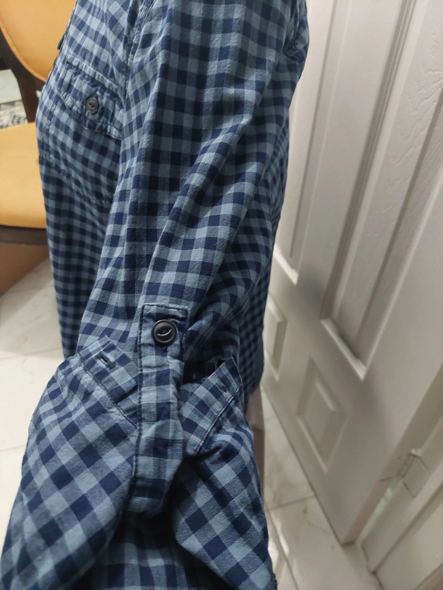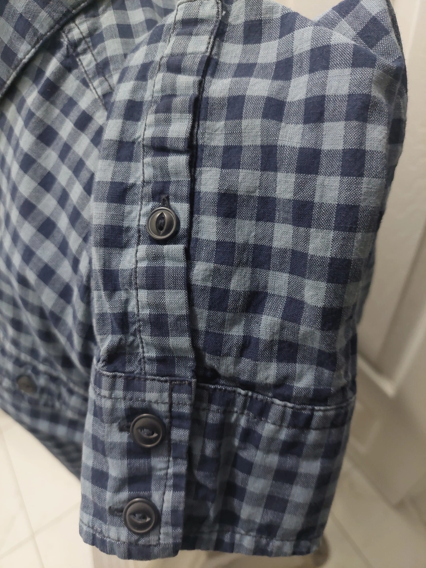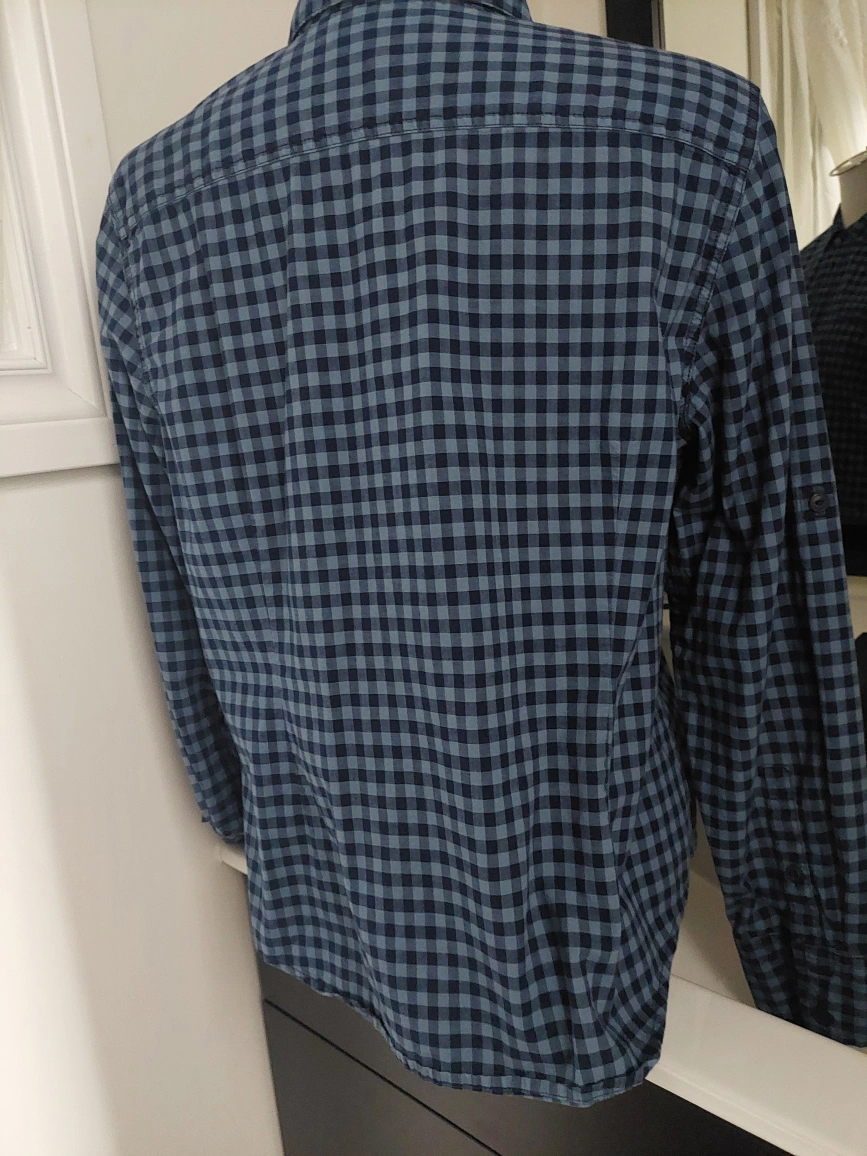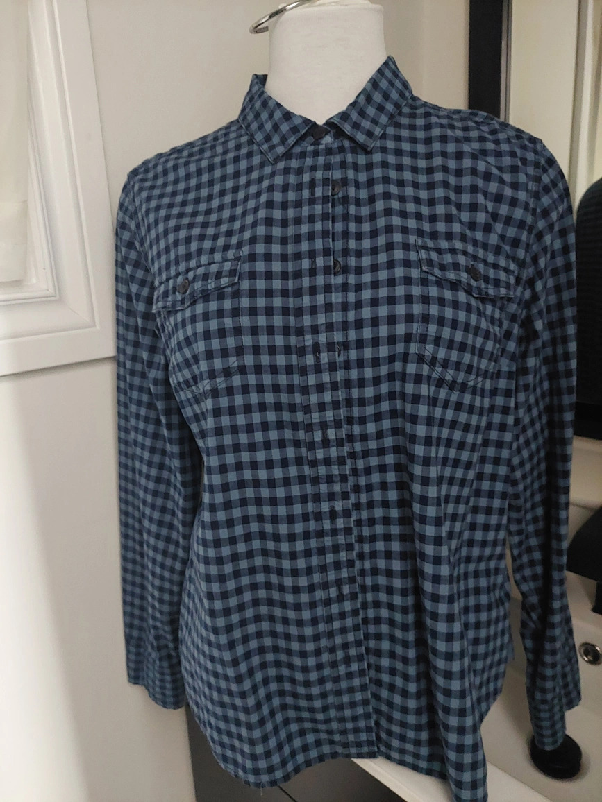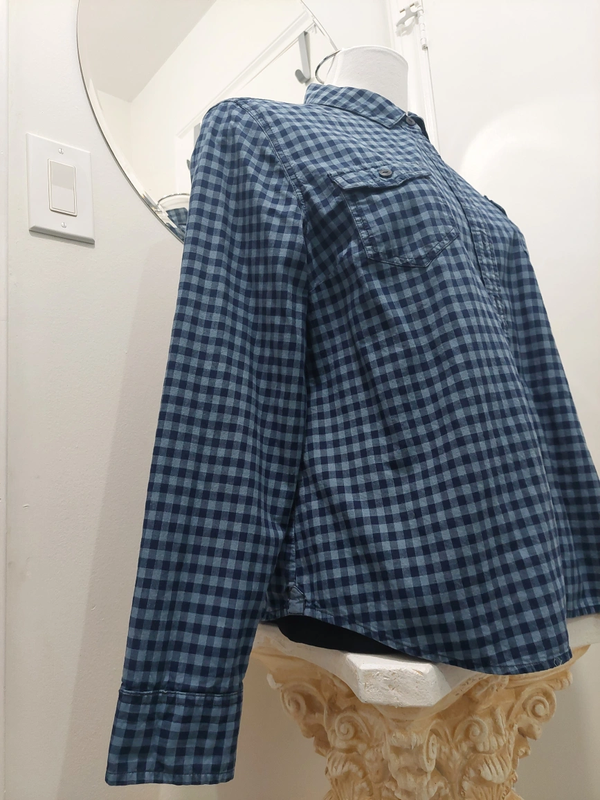 Long sleeve button-up shirt with a blue and black plaid pattern. Two chest pockets with button closures. Fitted