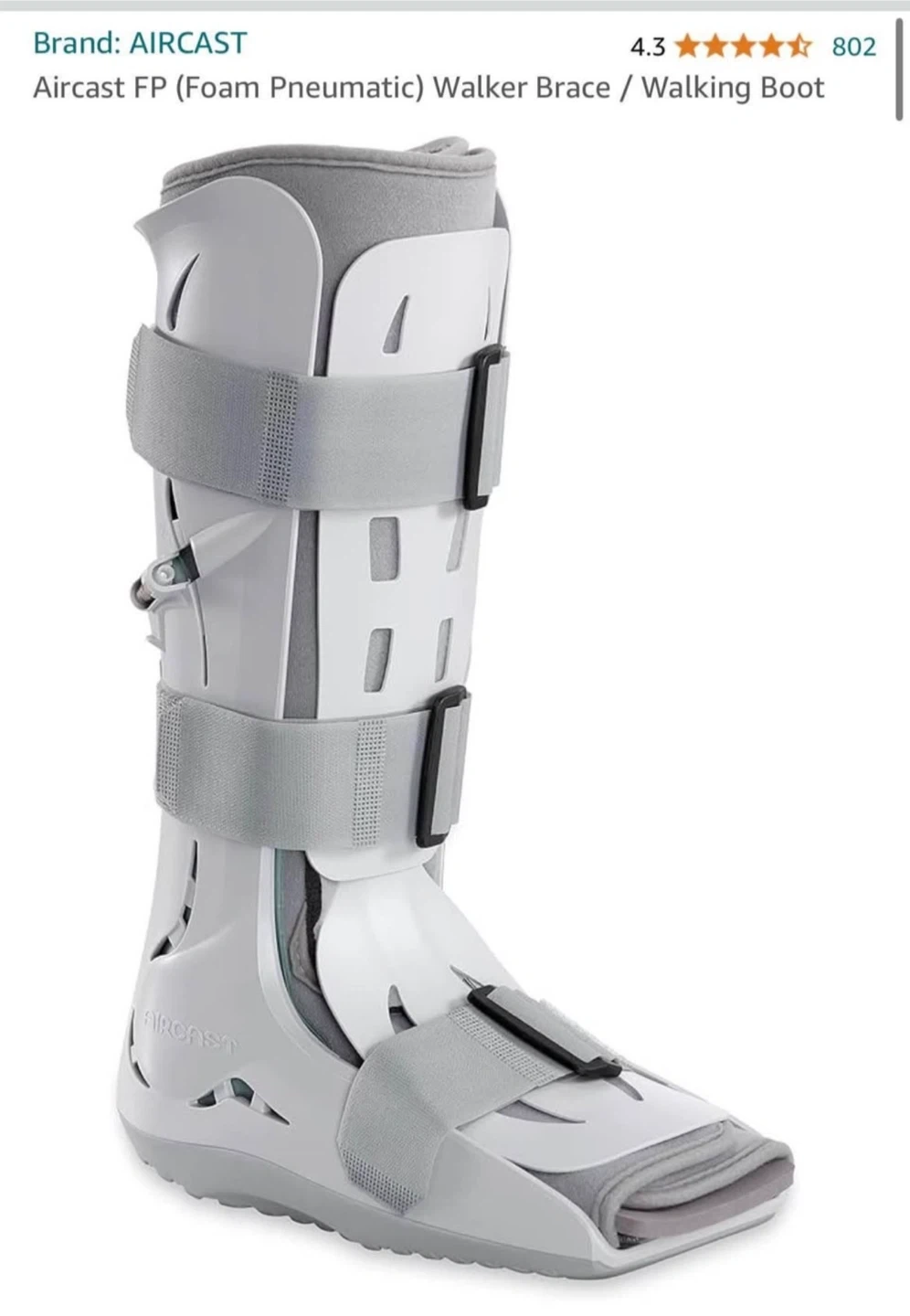 Aircast FP Foam Pneumatic Walker Brace/Walking Boot. It's a grey and white medical boot. Includes adjustable straps.