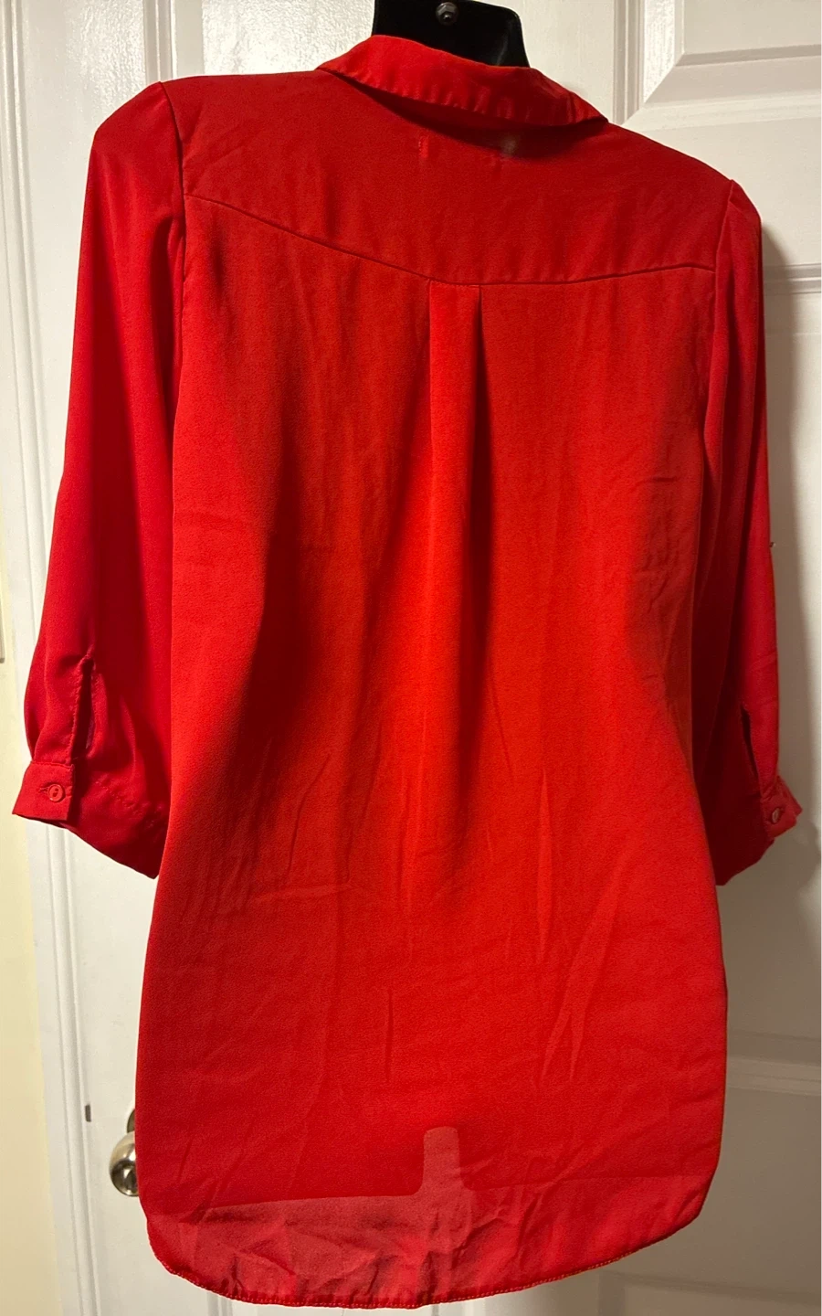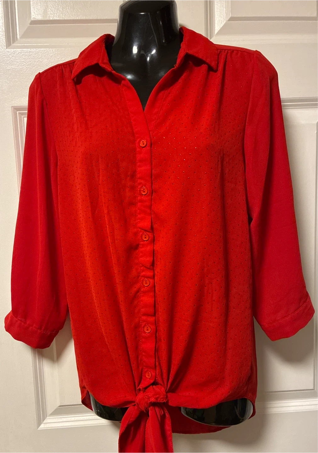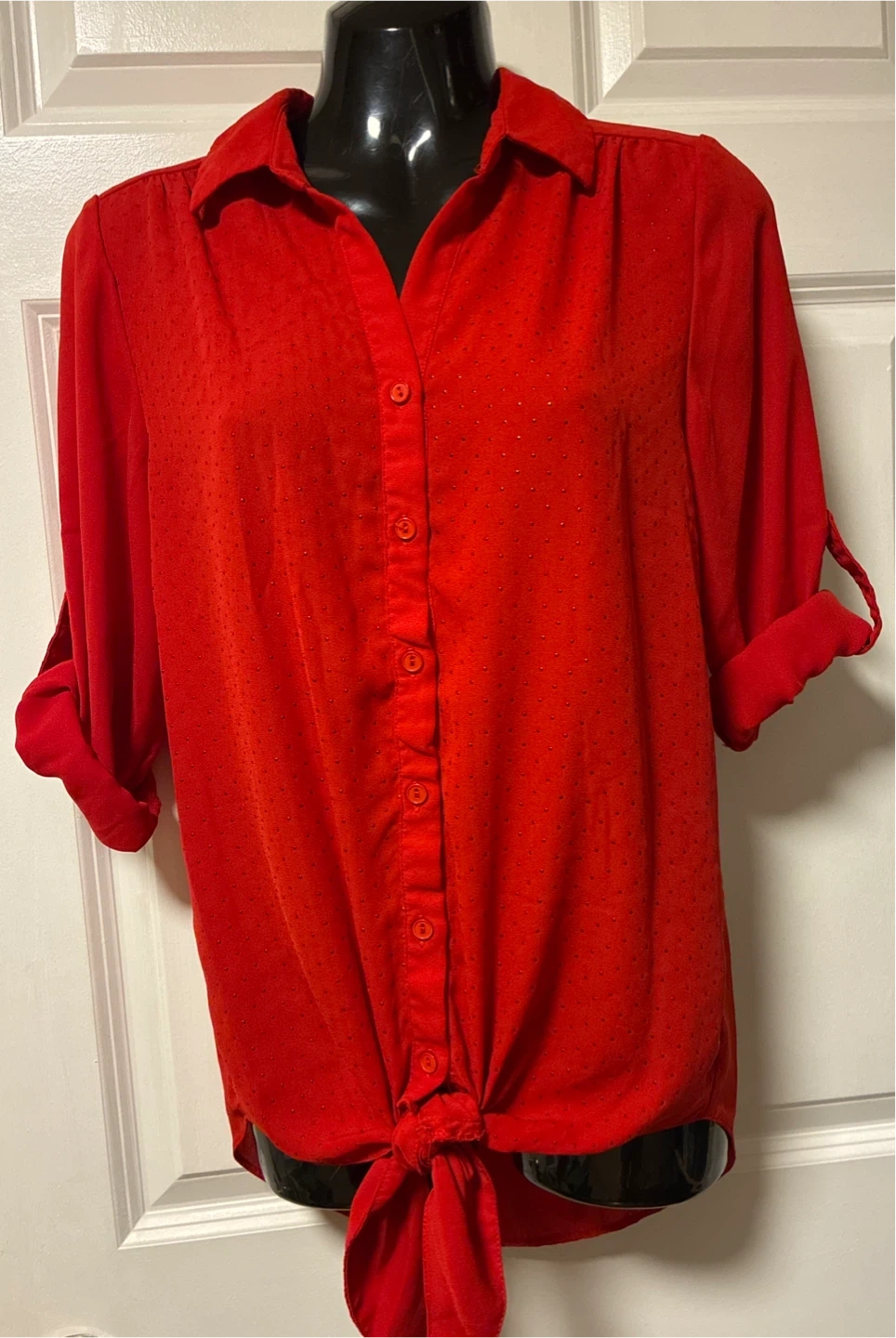 A bright red collared blouse with a subtle sparkle pattern. It has a button-up front and a tie detail at the waist. The sleeves are cuffed and can be rolled up. It's a stylish top for various occasions!