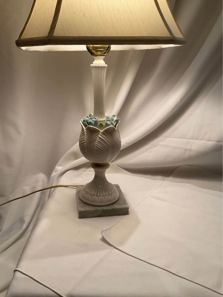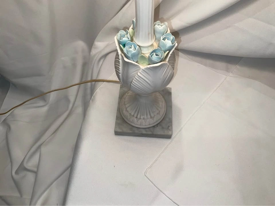 Stunning vintage porcelain table lamp, made in Italy. Features beautiful, delicate eggshell blue flowers with no chips. In pristine condition. Has a marble Carrera base. * No shade *. From a smoke & pet free home. Cash Only - Richmond Hill / Bathurst & King Rd.