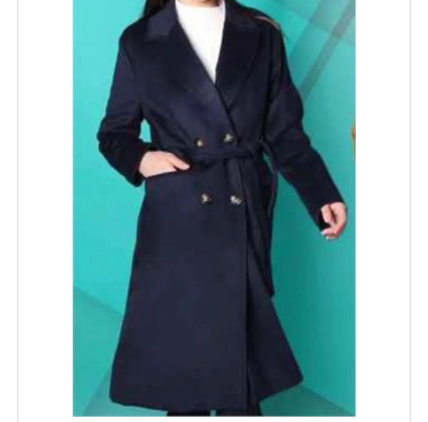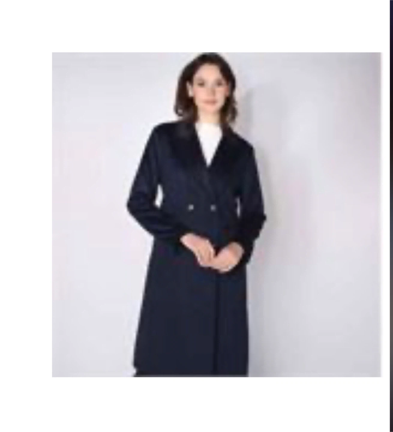 A stylish navy coat with a double-breasted front .It's designed for a sophisticated look. This coat is knee-length and made from a durable fabric.