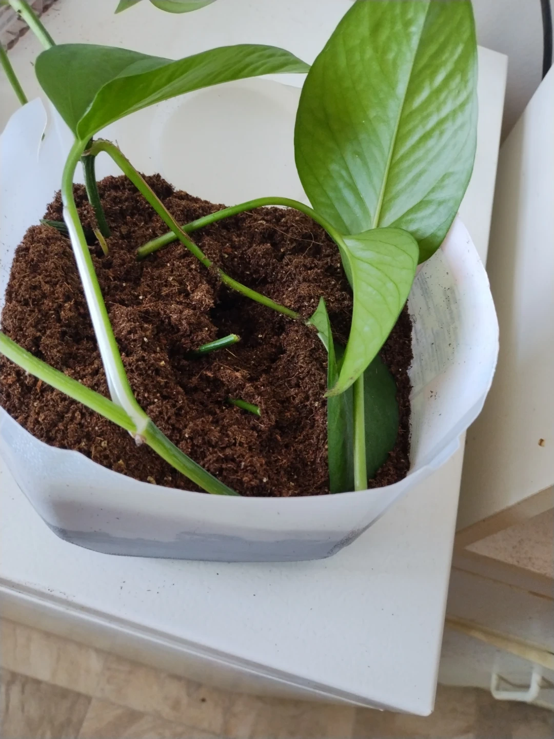 Pothos plant cuttings rooted in soil. These are easy-to-care-for houseplants. They're great for beginners or for expanding your plant collection!