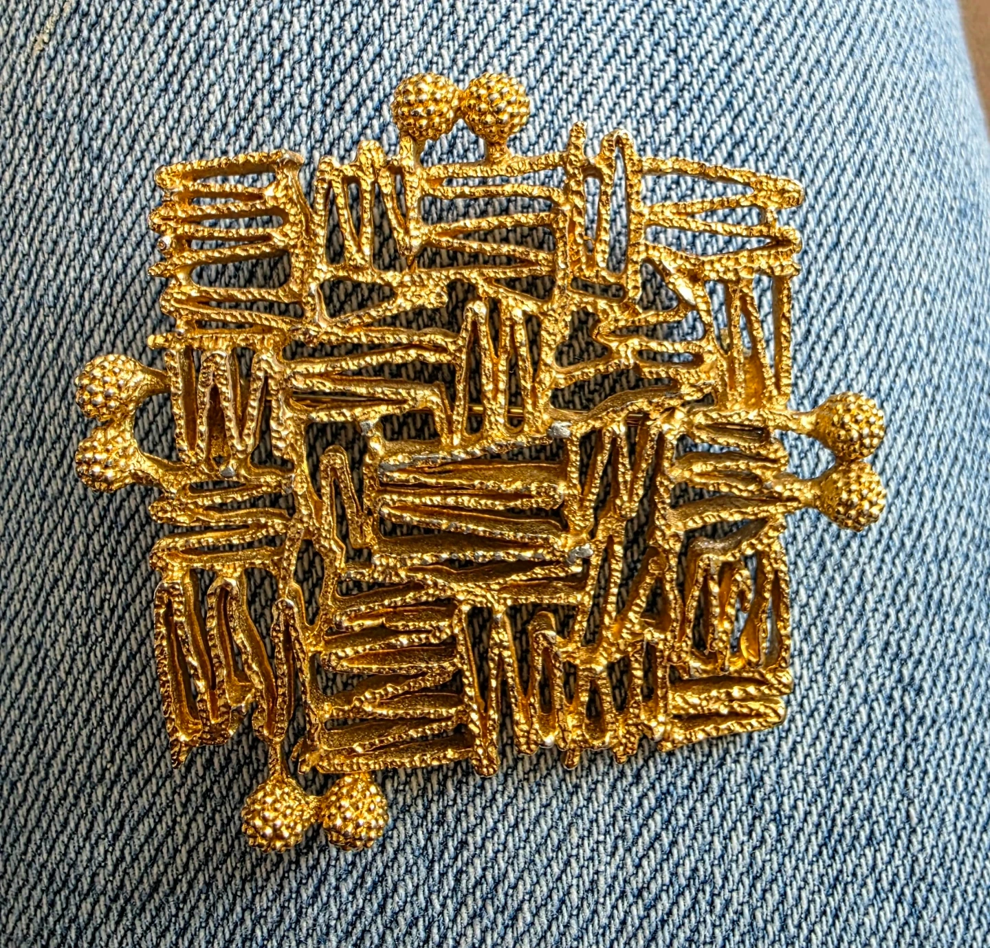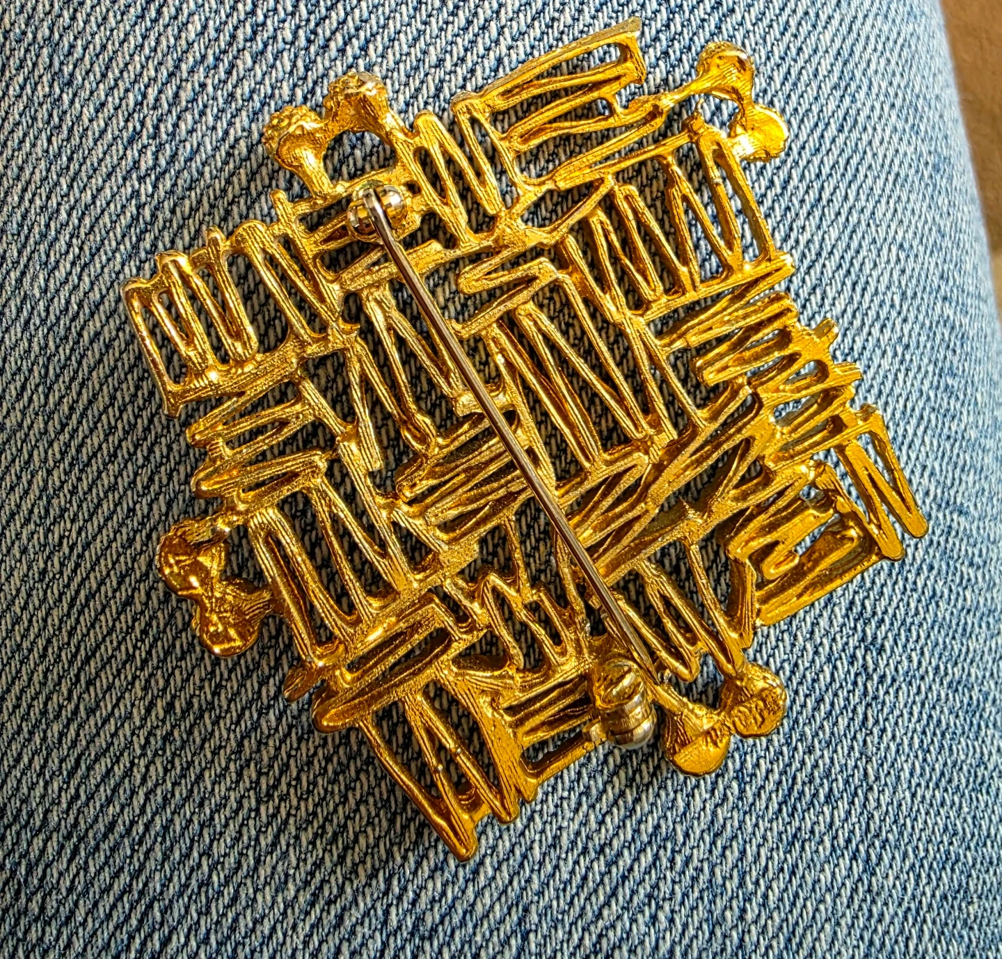 This vintage brooch has a unique abstract design in a gold tone finish. It's a striking accessory that adds a unique touch to any outfit. The pin backing is secure and functional.