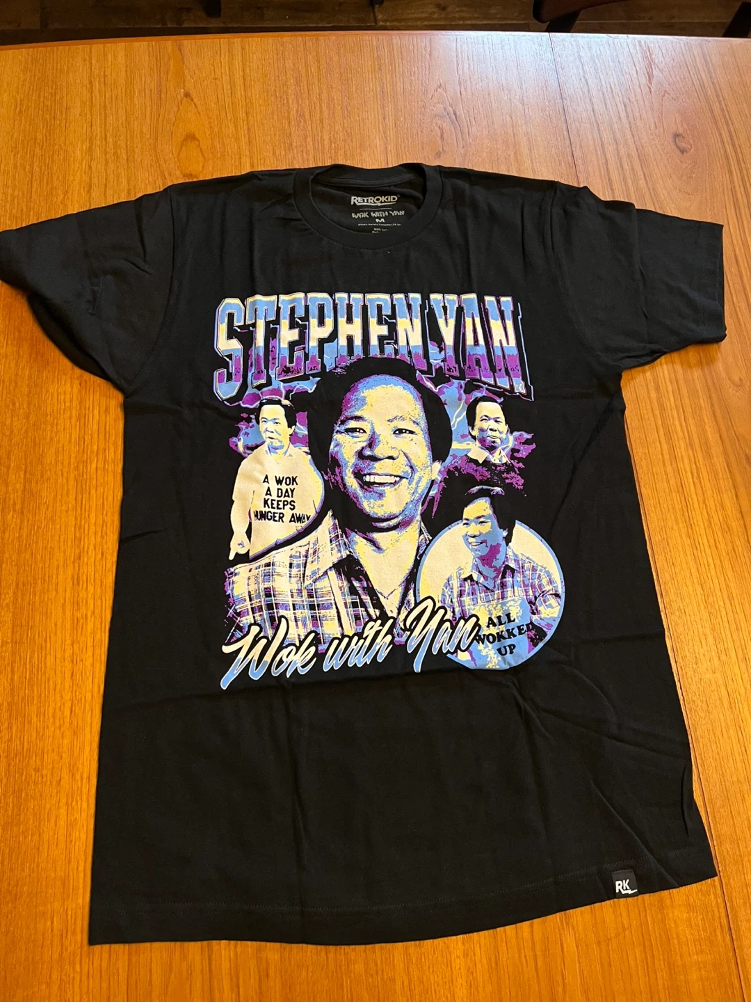 Black t-shirt featuring Stephen Yan from Wok with Yan. Made with 100% cotton. Size medium.