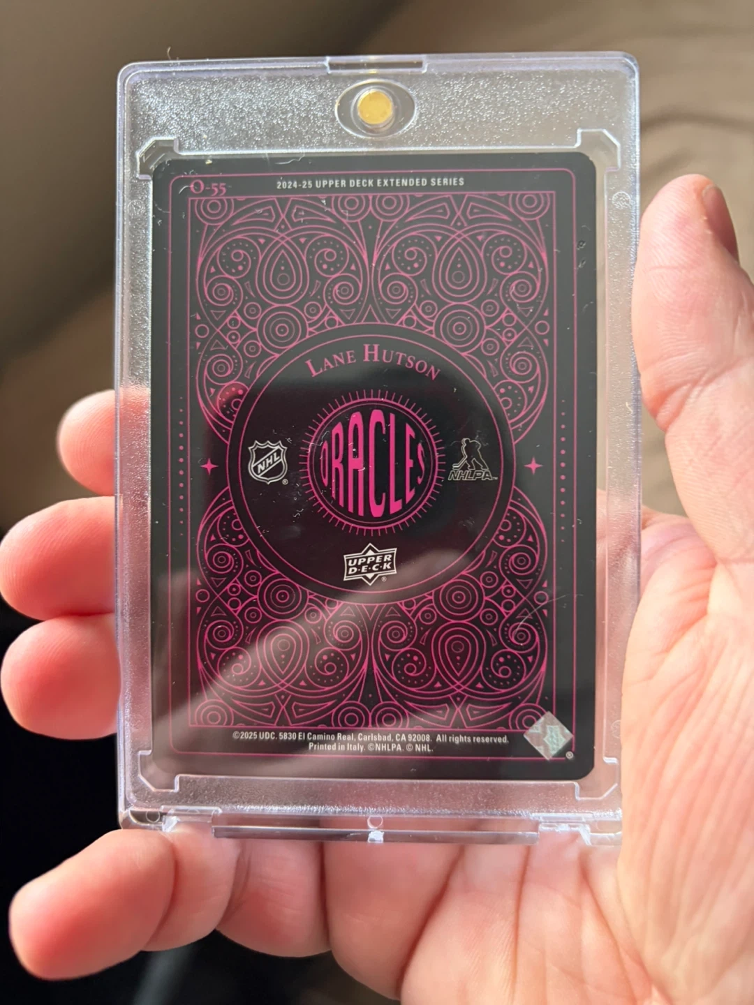 This is a 2024-25 Upper Deck Extended Series hockey card featuring Lane Hutson. It's from the Oracles set. Card is in a protective case.