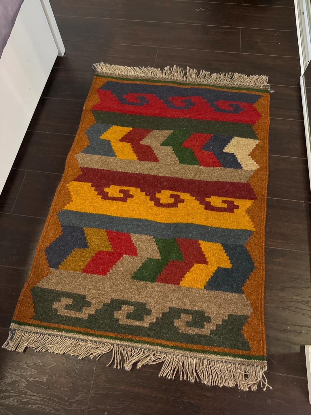 Selling a colourful area rug! It's new and would add a pop of colour to any room. It features a unique pattern with a variety of colours, including red, yellow, green, and brown. It's perfect for adding a touch of warmth and style to your home. I have two of them! Selling each for 60$.
