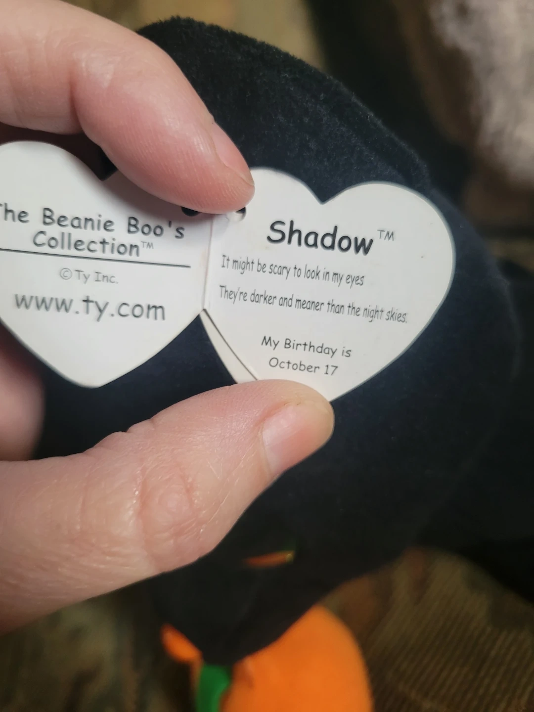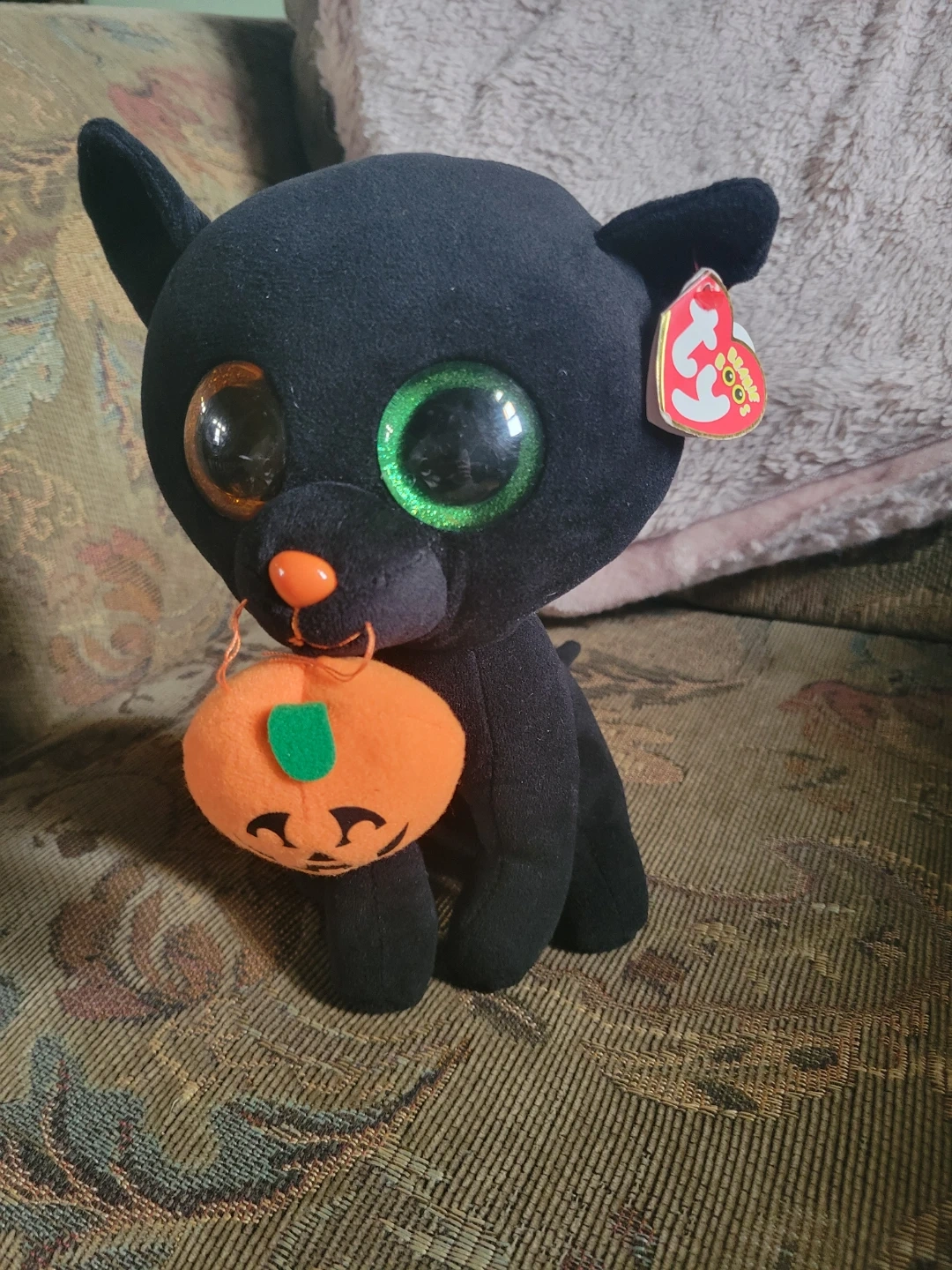 This is Shadow, a black 9" Beanie Boo cat with large, glittery eyes. It's holding a small pumpkin accessory! Its birthday is October 17.
