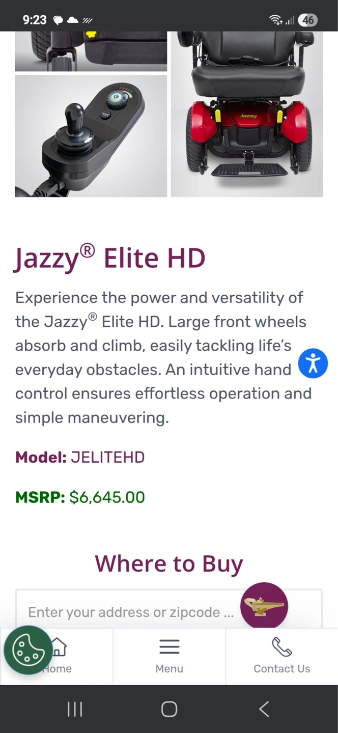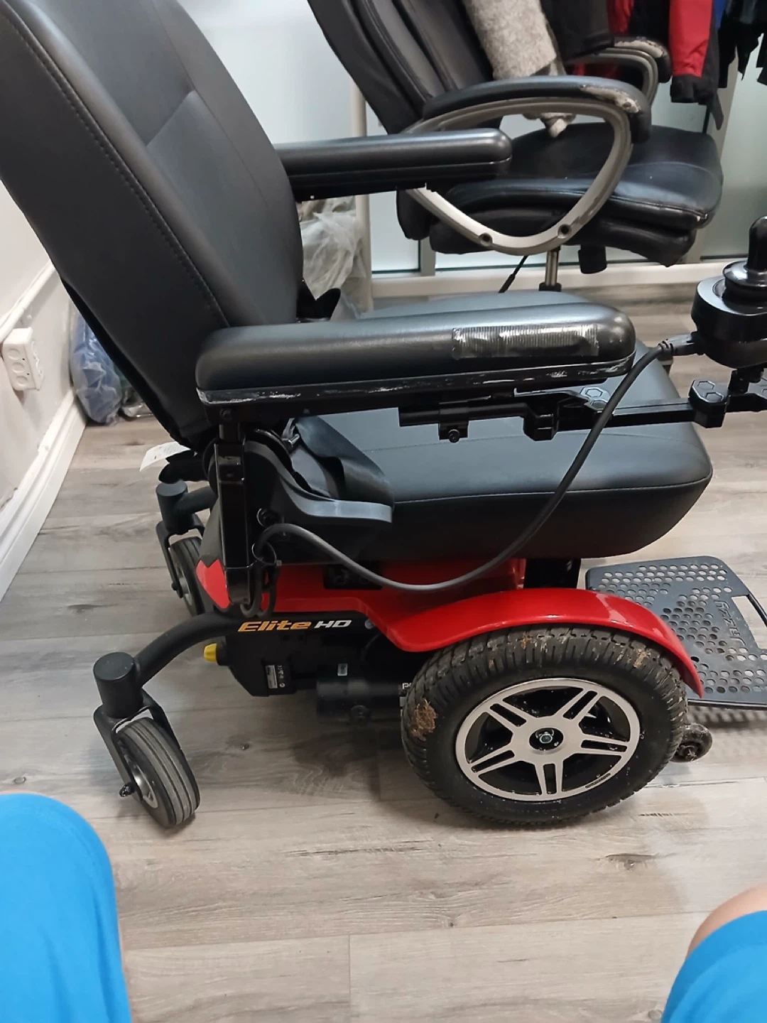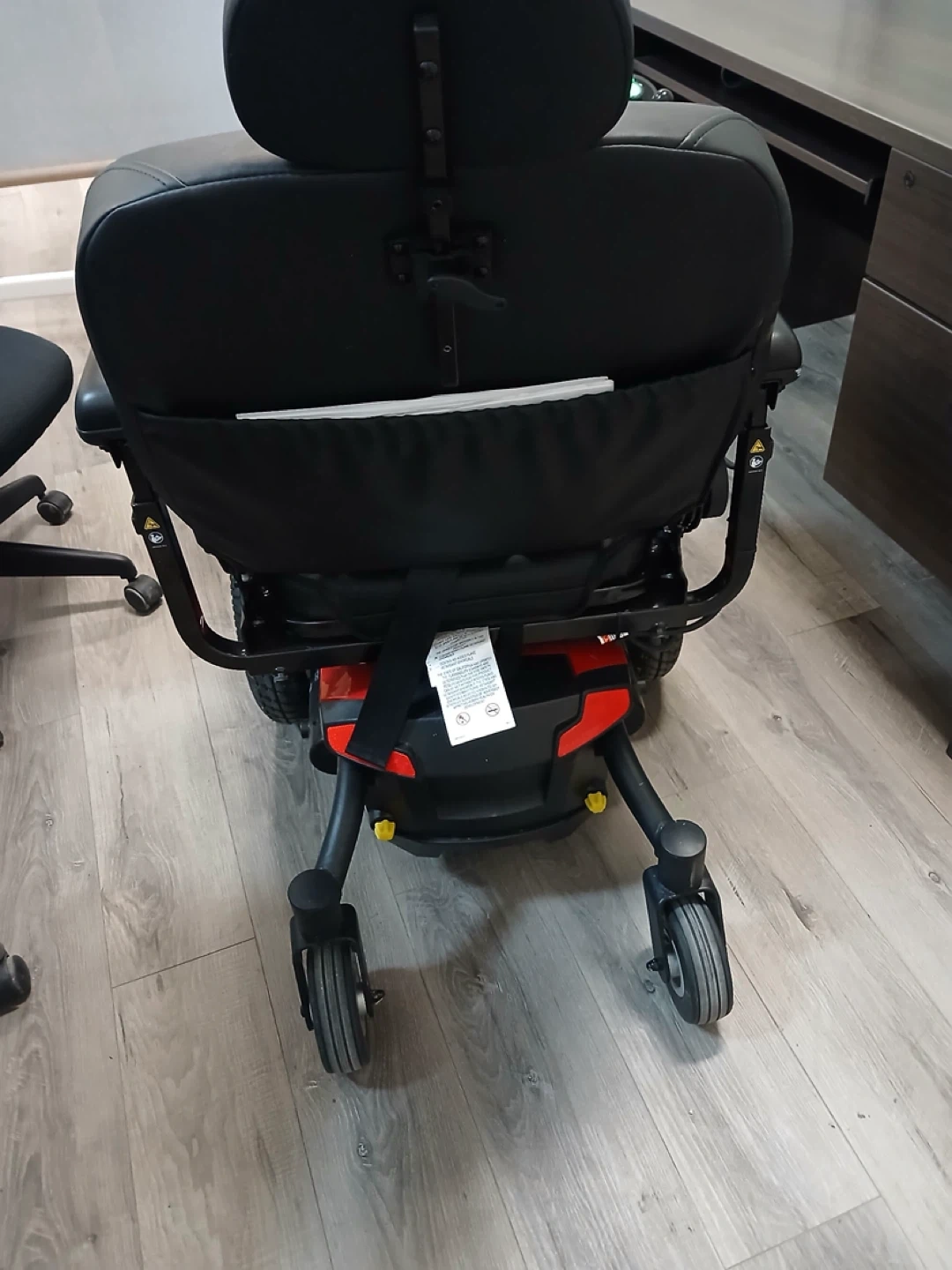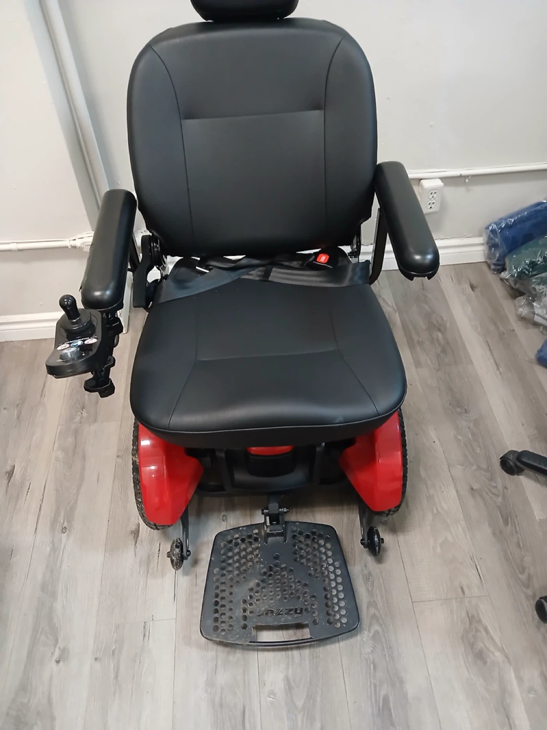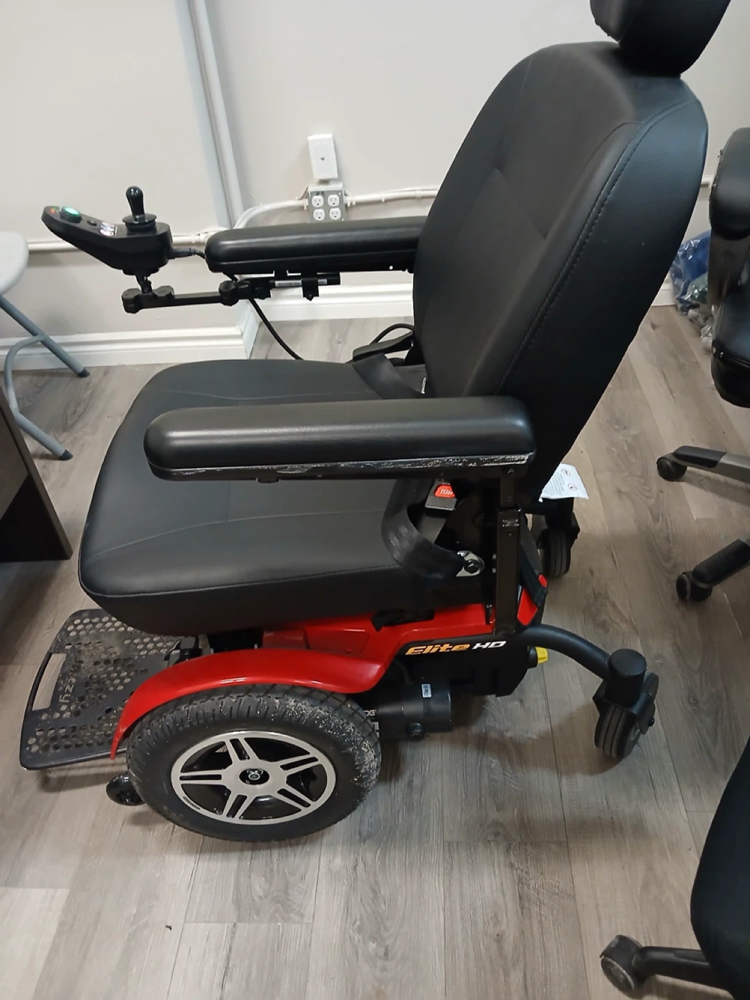 Jazzy Elite HD power wheelchair. Black vinyl seat and headrest. Red body accents. Intuitive joystick control for effortless operation. Large front wheels for tackling obstacles.