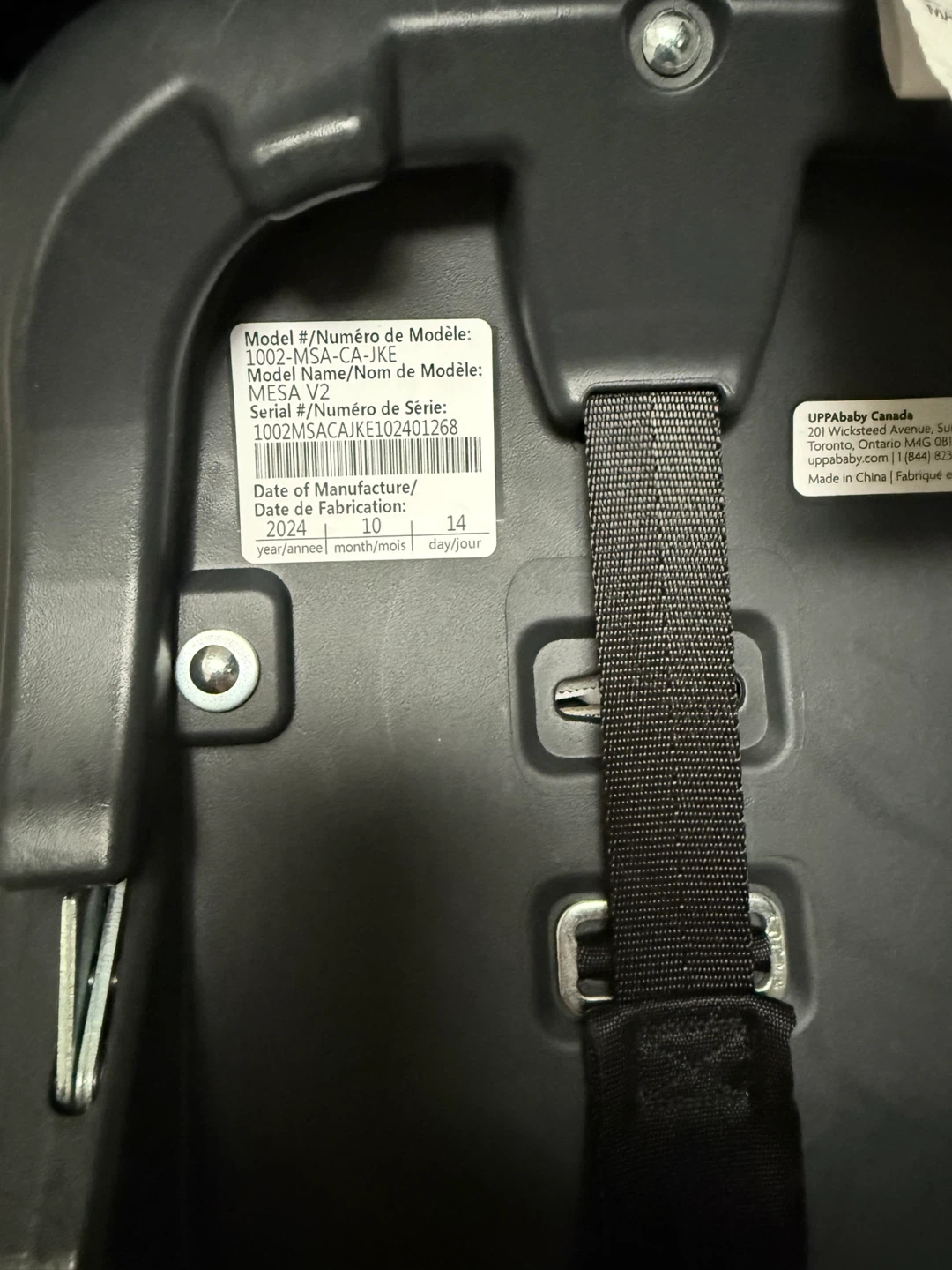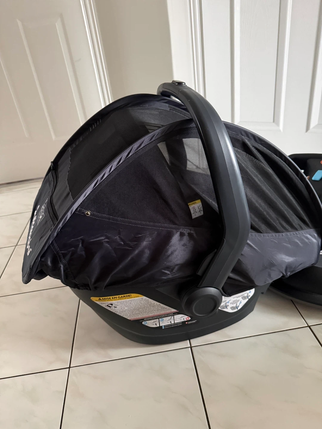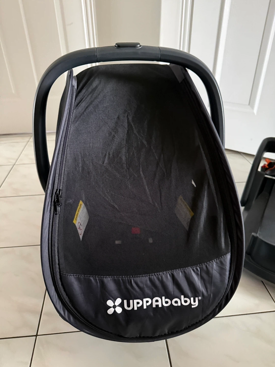 UPPAbaby MESA V2 infant car seat and base. Includes a black UPPA baby sunshade with zipper closure. This car seat system is black and designed for infants.