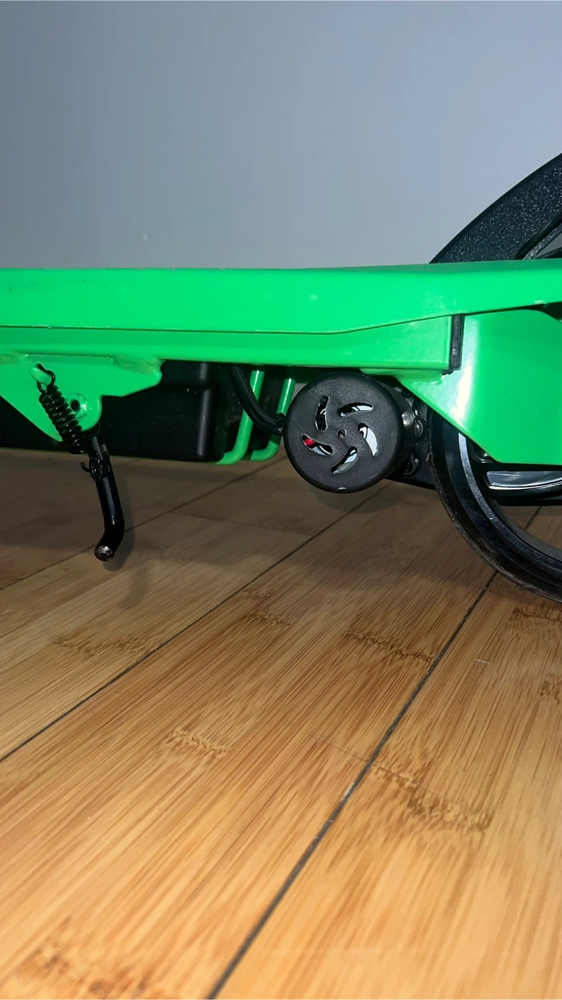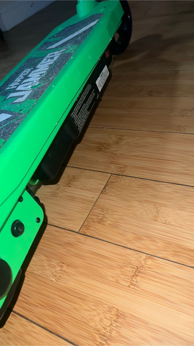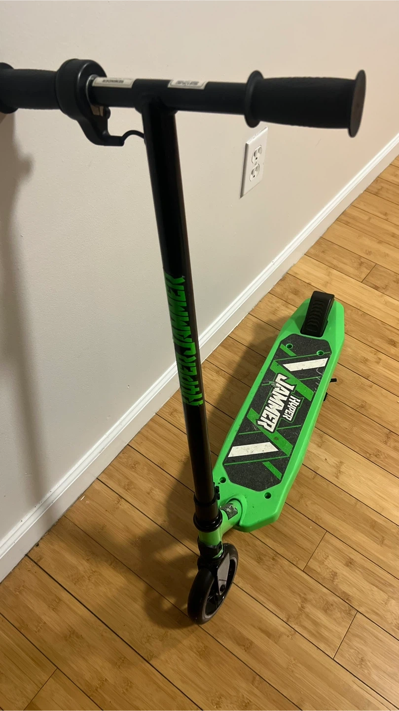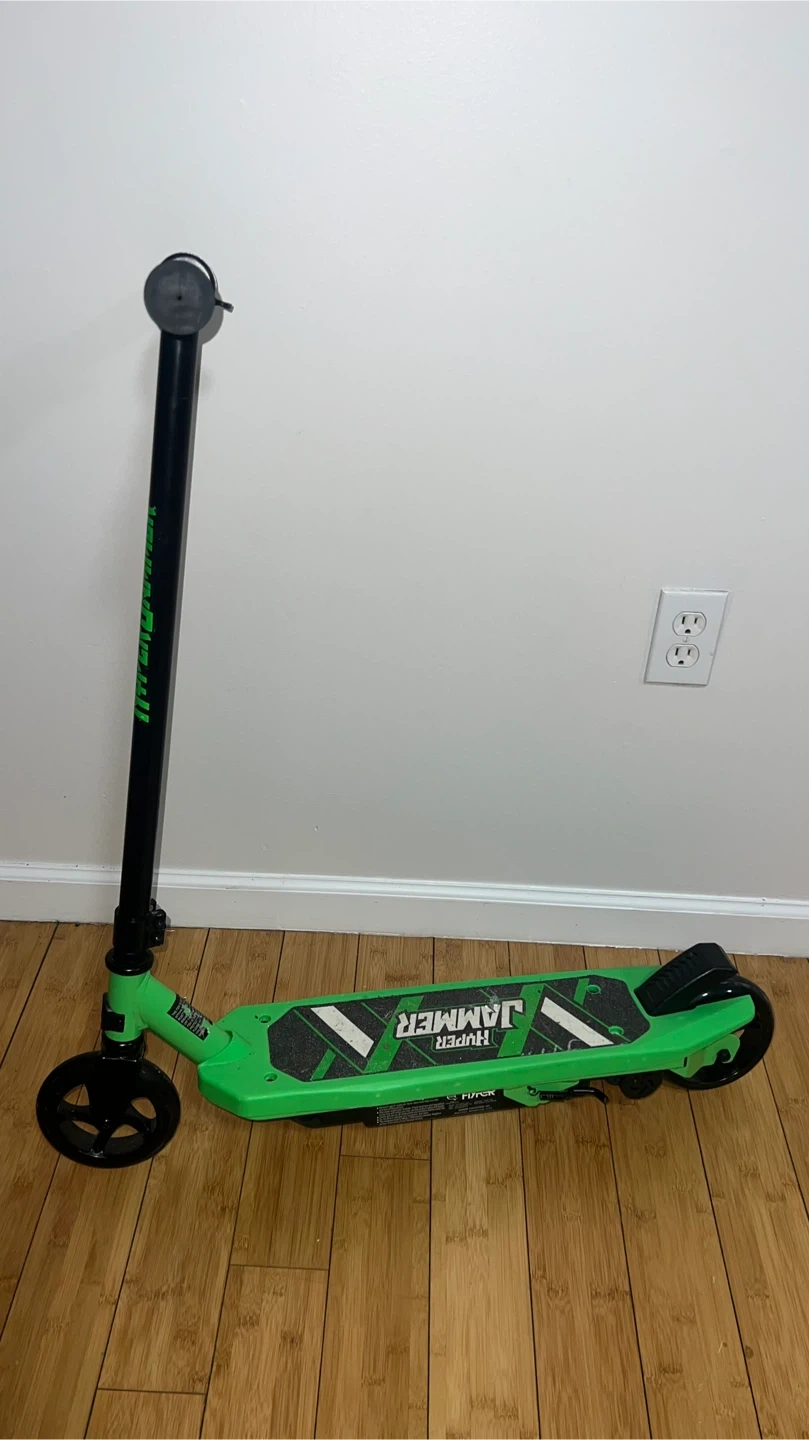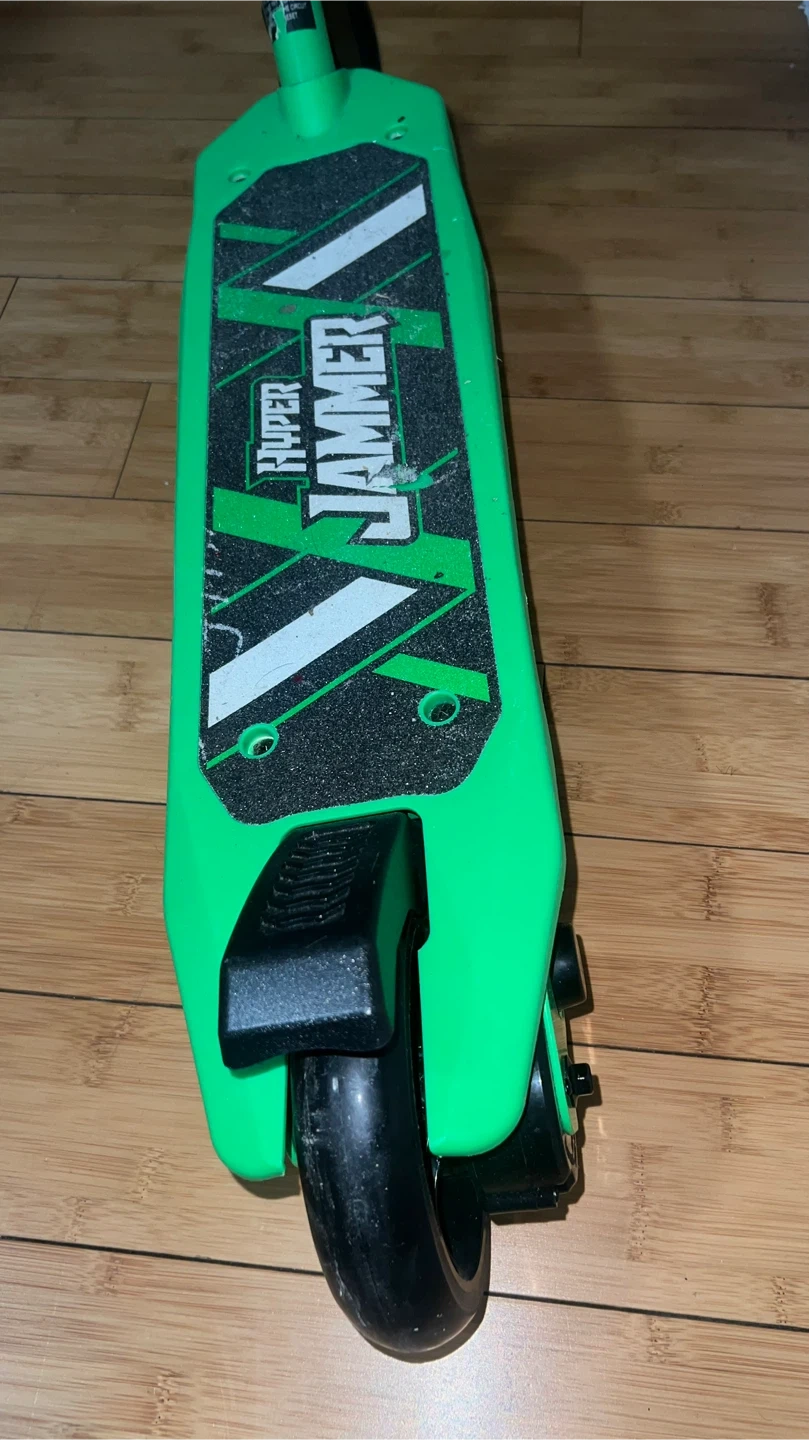 This is a green Hyper Hammer electric scooter. It's a fun ride for kids! The scooter is designed for easy use and enjoyment.