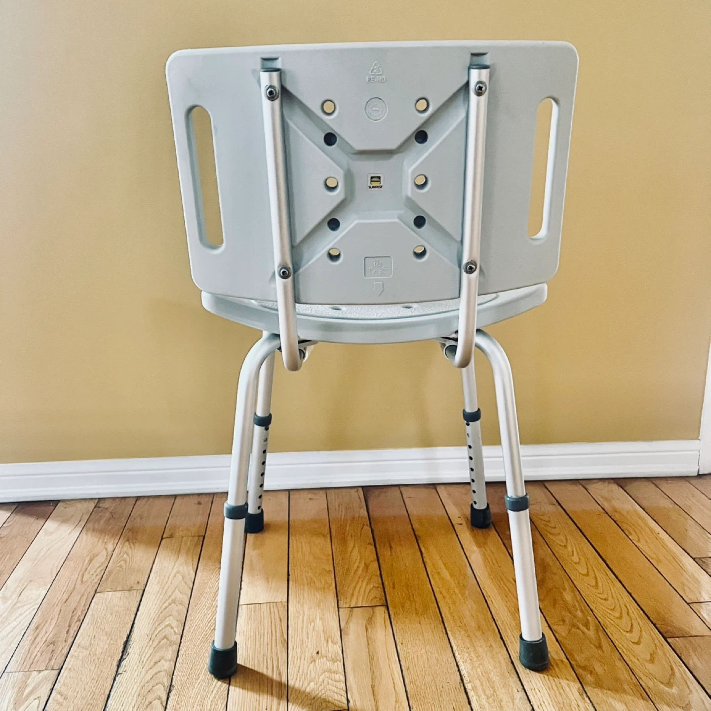 This bath chair provides a sturdy seating option for your shower. It's constructed with a durable plastic seat and backrest. The height is adjustable to suit your needs.