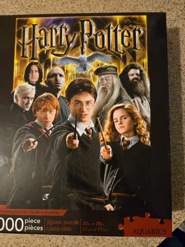 Selling a Harry Potter jigsaw puzzle by Aquarius! It's a 1000-piece puzzle with a framing format. The completed puzzle is 20 x 28 inches (51 x 71 cm)