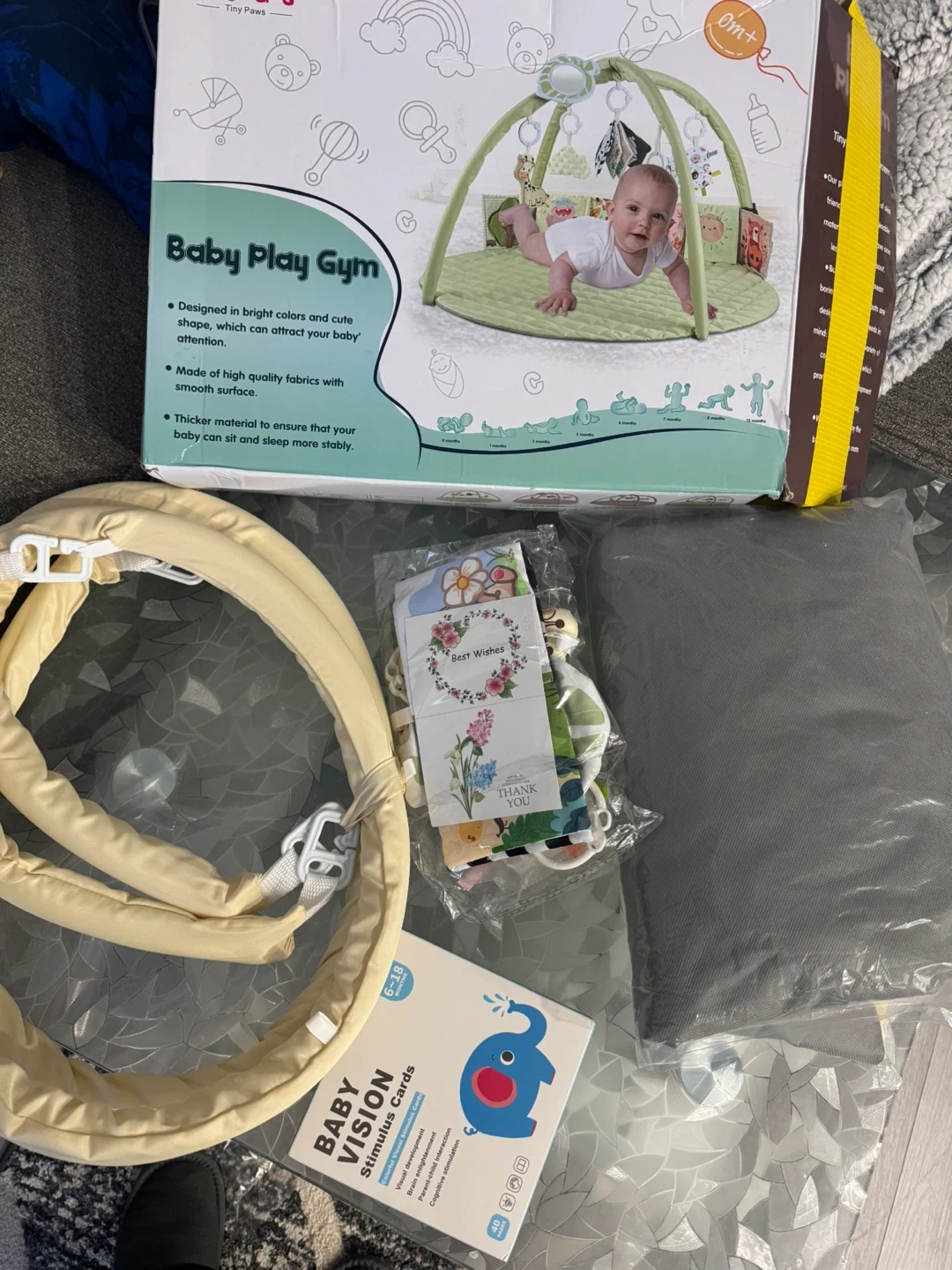 Selling a Tiny Paws Baby Play Gym, suitable for newborns and up (0m+). It's designed with bright colours and cute shapes to attract your baby's attention. The mat is made of high-quality fabric with a smooth surface, and it's thicker to ensure your baby can sit stably. Comes with baby vision stimulus cards too