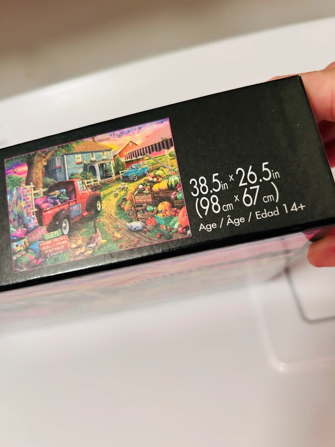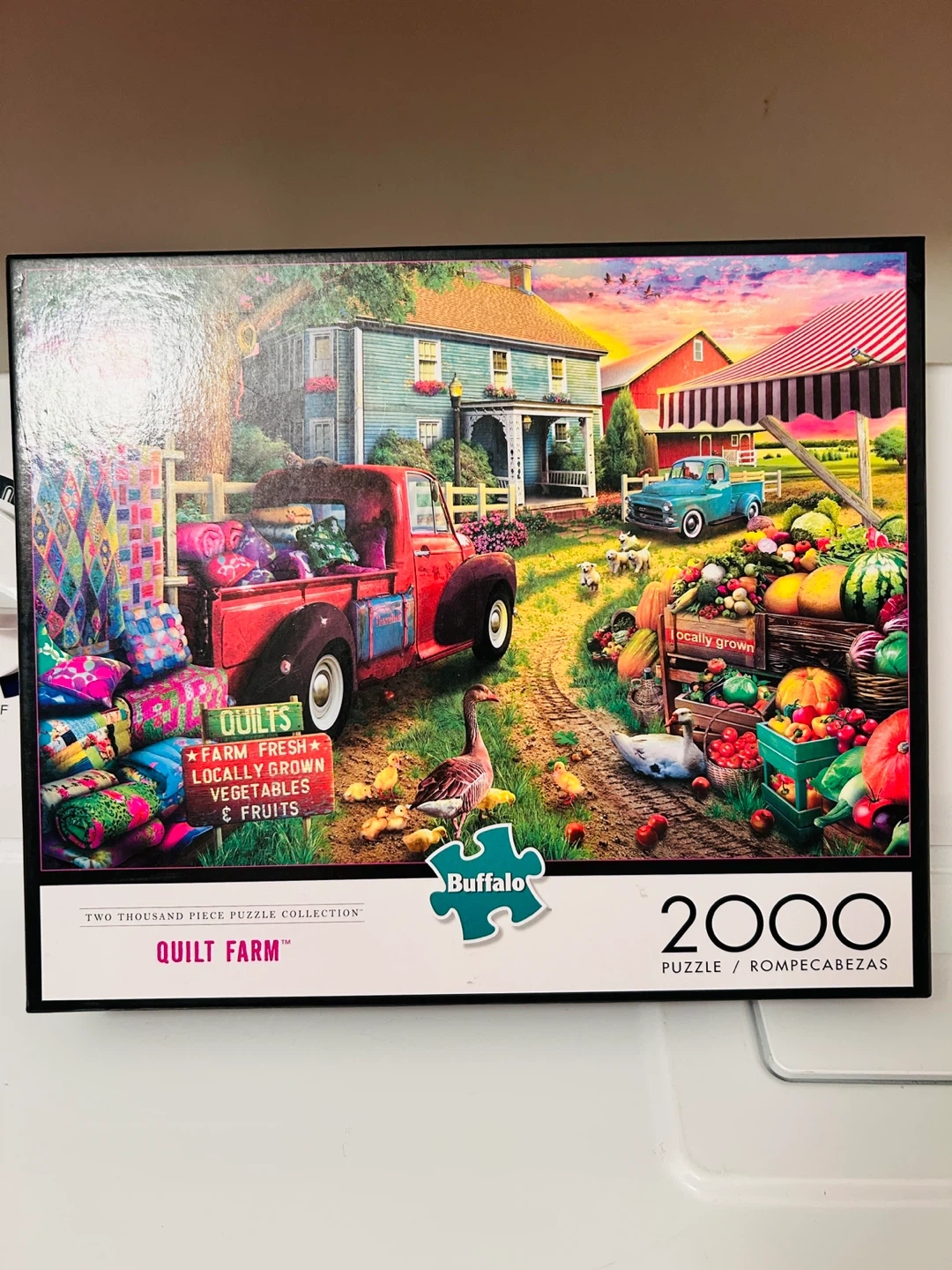 Buffalo Games 2000 piece jigsaw puzzle featuring the "Quilt Farm" design. It's a scenic farm image with quilts, a red truck, and fresh produce. This puzzle is for adults and teens who enjoy challenging puzzles.