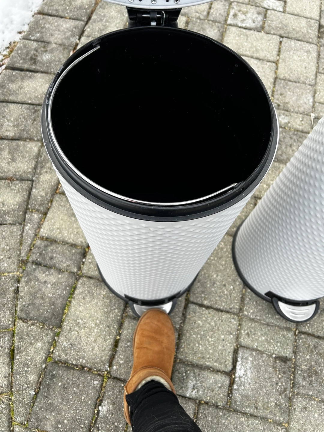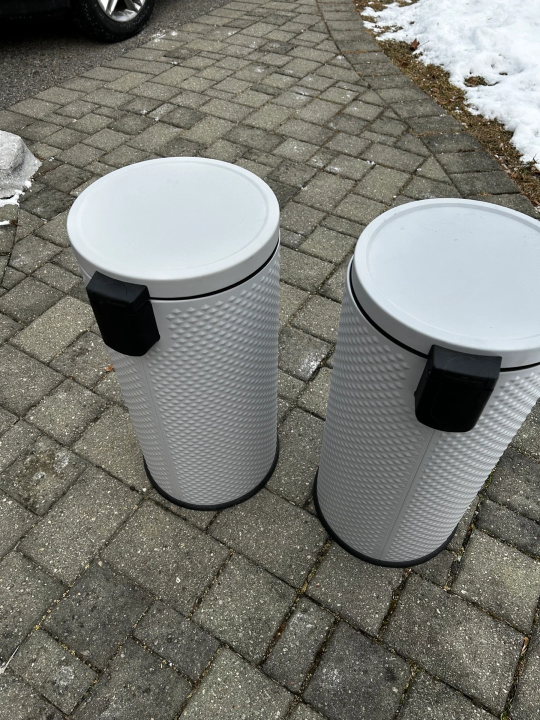 Two white step-on trash cans. Grey lids and textured bodies. Foot pedal operation. soft close. Pick up area Whites Rd and 401