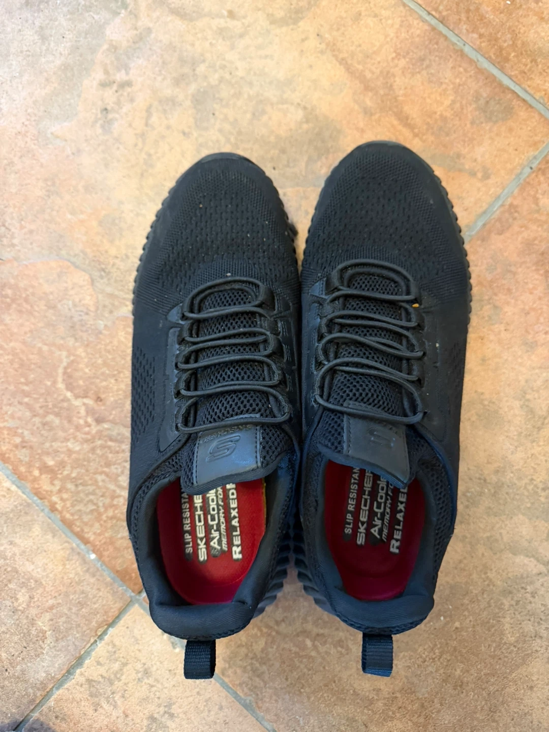 Skechers men's black slip-resistant shoes with Air-Cooled Memory Foam insoles. These shoes feature a relaxed fit and a slip-resistant sole. They're great for work or everyday wear where you need extra traction. Size 9.5.